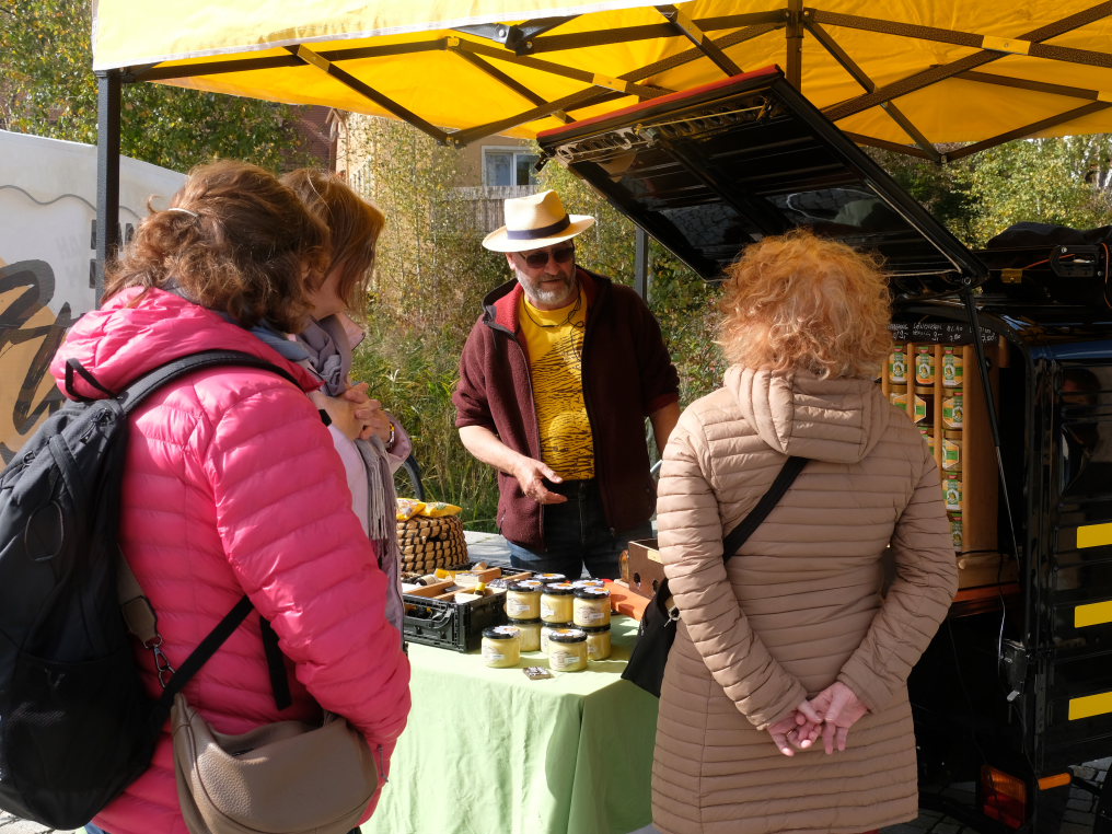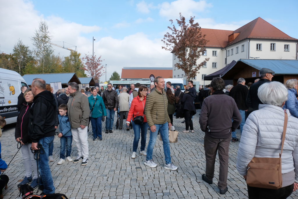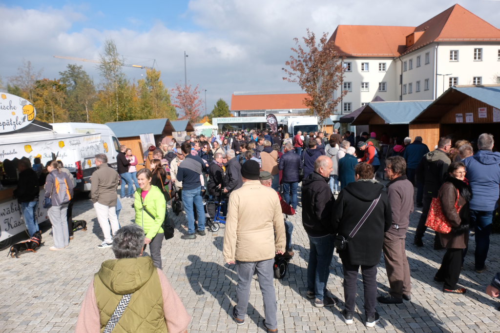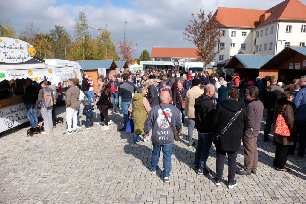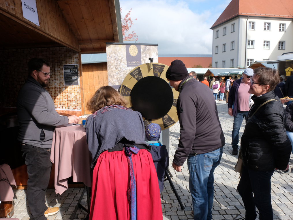 Auf dem Platz am Fuße der St. Verena Kirche fand der traditionelle Bauernmarkt statt, wo neben vielen arrivierten Anbietern wie die Metzgerei Seif aus Hauerz, der Allgäuer Genussbäcker, auch wieder das Backhäusle Seibranz mit seiner berühmten Dinete lockte. Die dann leider allzu früh ausverkauft war. Daneben bot die Schäfereigenossenschaft Finkhof ihre kuscheligen Produkte an, auch das FeelMoor Gesundresort und die Bad Wurzacher Jugendarbeit war neben vielen anderen mit Food- bzw. Non-food Ständen vertreten.