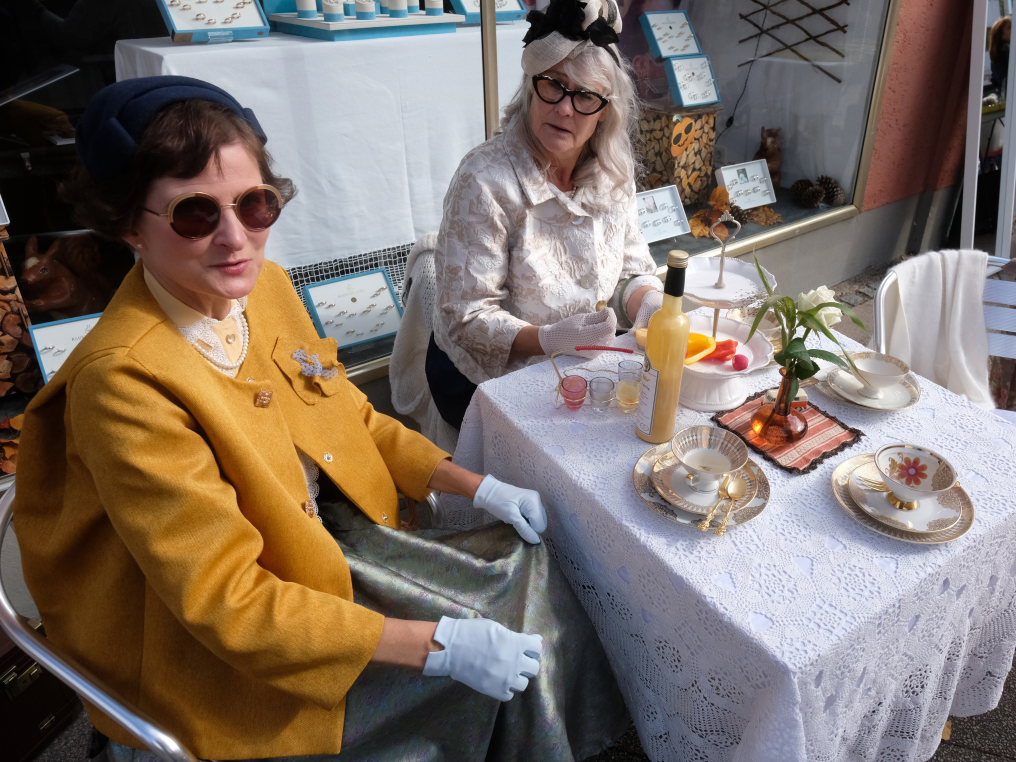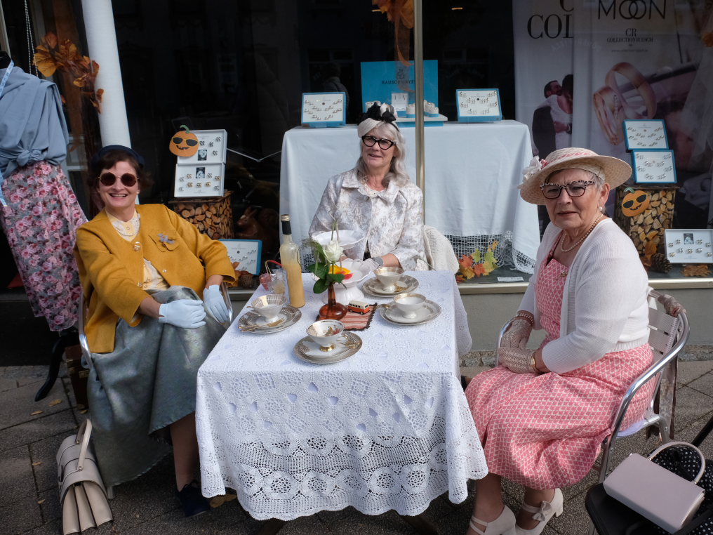 So etwa in der Herrenstraße, wo Optik Blickfang gemeinsam mit einem spezialisierten Fotostudio für Irisfotografie die schönsten Augen Bad Wurzachs suchte. Gleich daneben genossen die Damen des Nähkreises in ihrer selbstgenähten Mode aus den fünfziger Jahren die Sonne, natürlich mit dem damaligen In-Getränk, das bei keinem Kaffeekränzchen fehlen durfte: Eierlikör.