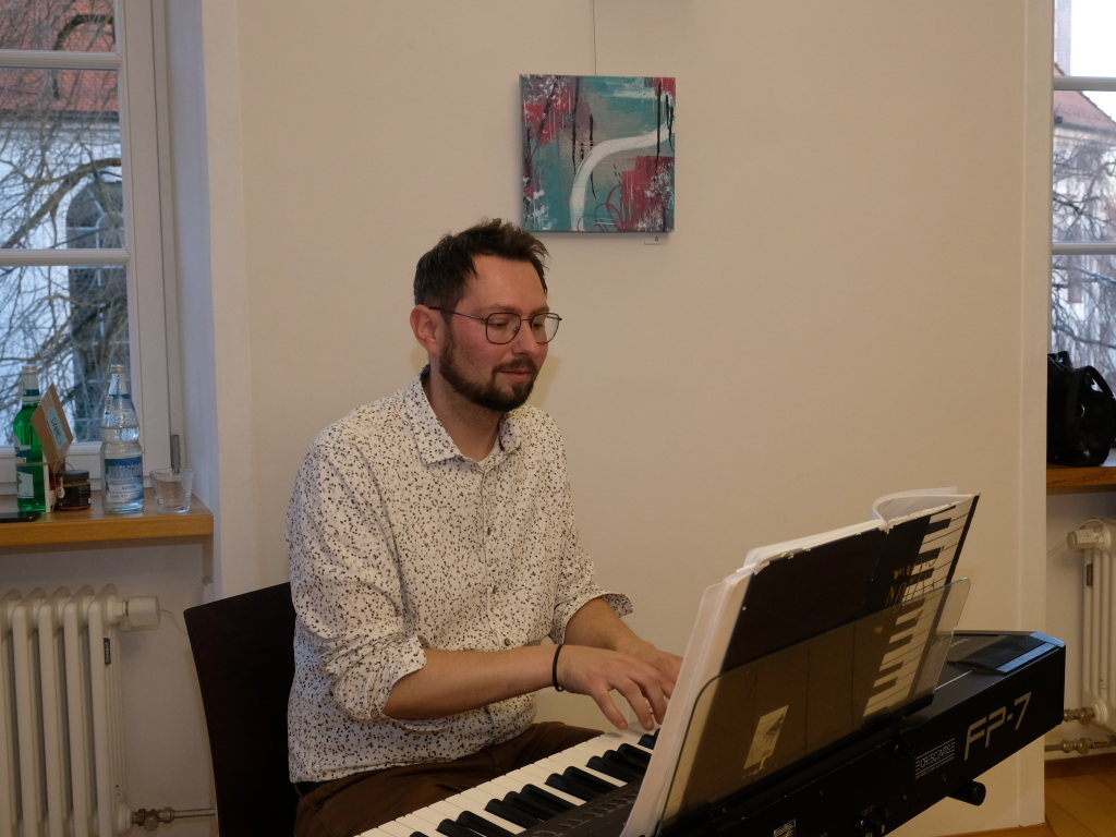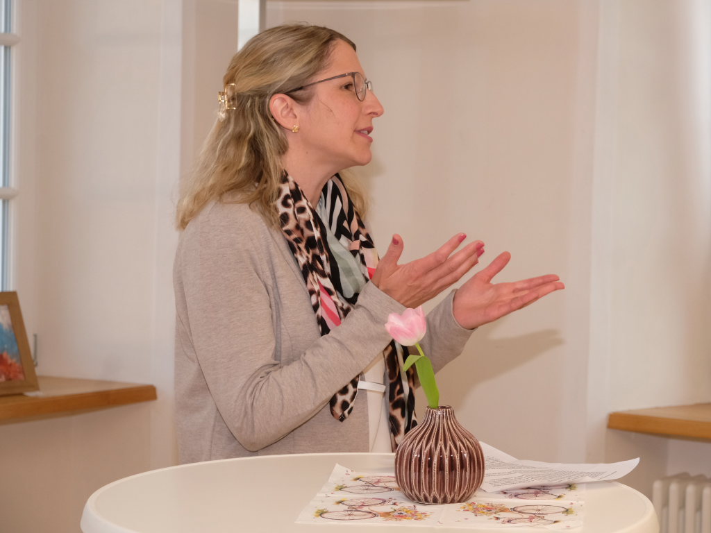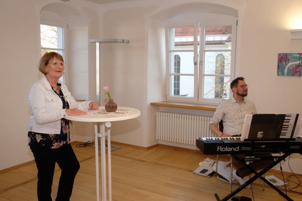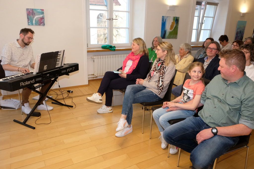 „Habt ihr Euch schon mal gefragt, warum so viele Menschen im Erwachsenenalter den Zugang zu ihrer Kreativität verlieren?“ stellte Dagmar Kolb während ihrer kleinen Einführung bei der vom bekannten Musiker Johannes Tress am Klavier hervorragend musikalisch begleiteten Vernissage, eine rhetorische Frage. Und schob gleich noch eine zweite hinterher: „Warum wird Malen oder Kreativsein auch heute noch oft mit Zeitverschwendung in Verbindung gebracht?“ Pablo Picasso, einer der wichtigsten Künstler des 20. Jahrhunderts hat dazu einmal gesagt: „Als Kind ist jeder ein Künstler, die Schwierigkeit liegt darin, als Erwachsener einer zu bleiben.“ – „Ich sehe Kreativsein überhaupt nicht als Zeitverschwendung an und gebe die Magie des Malens gerne weiter.“ Deshalb habe sie in den Jahren 2022 und 2023 eine Ausbildung zur Malbegleiterin gemacht, die sich ein wenig an den Beruf des Kunsttherapeuten anlehnt. Diese Malbegleitung bietet Dagmar Kolb in ihrem Atelier für Kinder ab 8 Jahren ebenso wie für Erwachsene einzeln oder in Kleingruppen an. „Es ist so toll zu sehen, dass man durch kreatives Schaffen zu sich selbst finden kann, Selbstliebe erfährt und einfach Freude hat.“