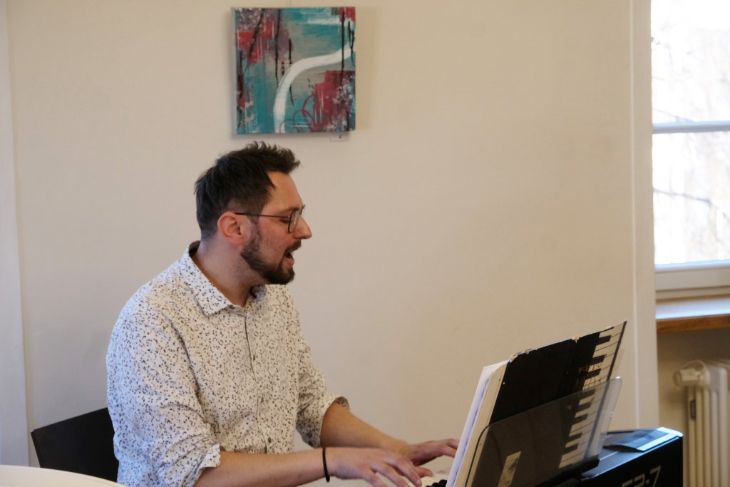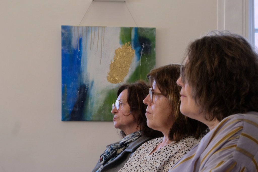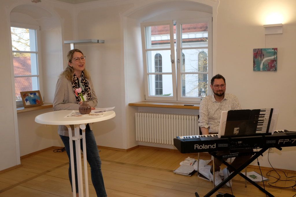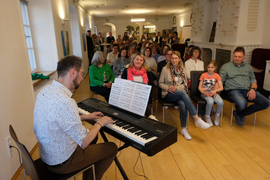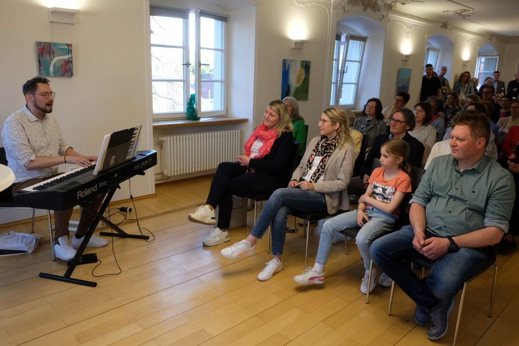 „Habt ihr Euch schon mal gefragt, warum so viele Menschen im Erwachsenenalter den Zugang zu ihrer Kreativität verlieren?“ stellte Dagmar Kolb während ihrer kleinen Einführung bei der vom bekannten Musiker Johannes Tress am Klavier hervorragend musikalisch begleiteten Vernissage, eine rhetorische Frage. Und schob gleich noch eine zweite hinterher: „Warum wird Malen oder Kreativsein auch heute noch oft mit Zeitverschwendung in Verbindung gebracht?“ Pablo Picasso, einer der wichtigsten Künstler des 20. Jahrhunderts hat dazu einmal gesagt: „Als Kind ist jeder ein Künstler, die Schwierigkeit liegt darin, als Erwachsener einer zu bleiben.“ – „Ich sehe Kreativsein überhaupt nicht als Zeitverschwendung an und gebe die Magie des Malens gerne weiter.“ Deshalb habe sie in den Jahren 2022 und 2023 eine Ausbildung zur Malbegleiterin gemacht, die sich ein wenig an den Beruf des Kunsttherapeuten anlehnt. Diese Malbegleitung bietet Dagmar Kolb in ihrem Atelier für Kinder ab 8 Jahren ebenso wie für Erwachsene einzeln oder in Kleingruppen an. „Es ist so toll zu sehen, dass man durch kreatives Schaffen zu sich selbst finden kann, Selbstliebe erfährt und einfach Freude hat.“