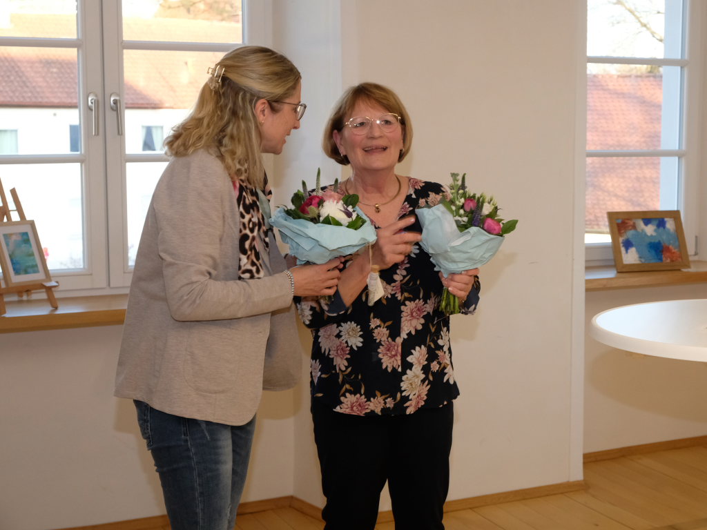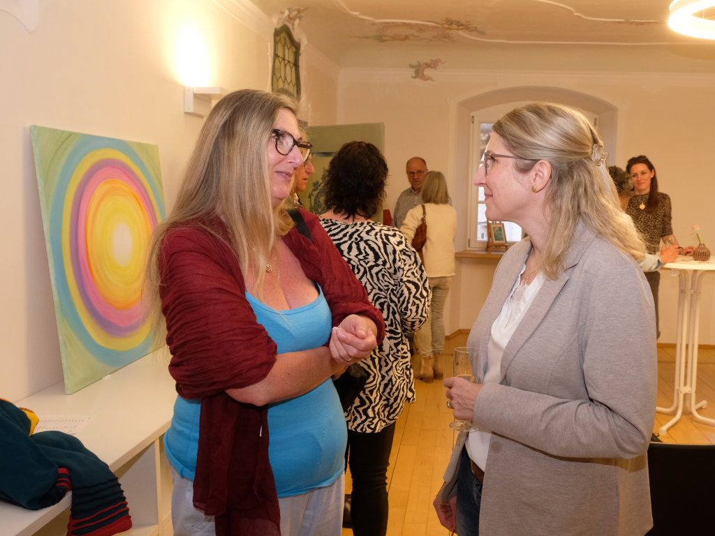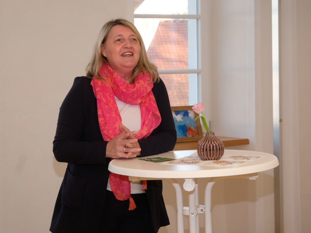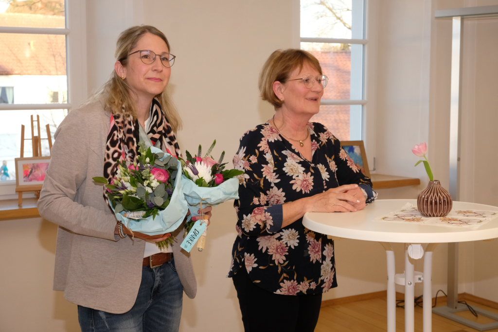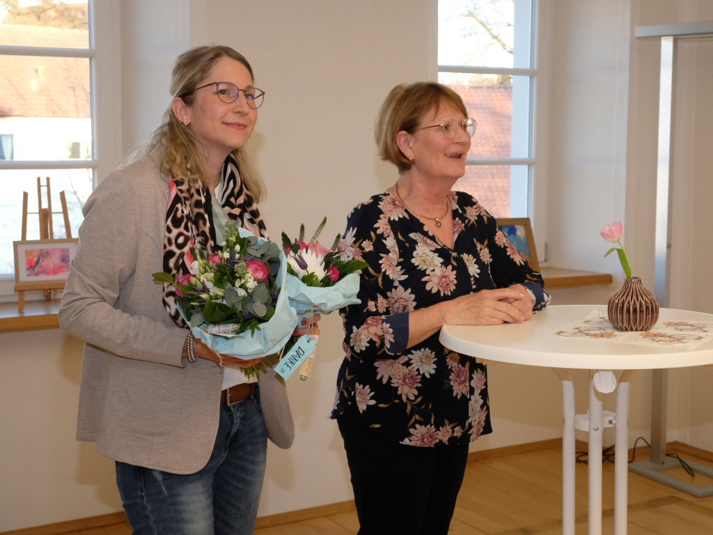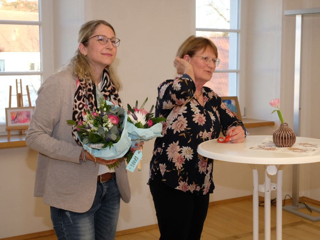 Am Ende ihrer Ansprache fand sie zahlreiche Worte des Dankes: Sie bedankte sich bei den Organisatorinnen der Ausstellungen, Christiane Linge und Doris Schäfer, sowie bei Bürgermeisterin Alexandra Scherer für die Möglichkeit, „in diesen tollen Räumlichkeiten ausstellen zu dürfen, die der Kunst einen so tollen Rahmen geben.“ Ein großer Dank ging auch an den Musiker Johannes Tress: „Du machst Kunst in einer anderen Form. Und lebst, was Du liebst.“ Bei ihrem Mann bedankte sie sich ebenfalls: „Ohne Dich würde ein Aufbau nie klappen.“ Und schließlich ging ein großes Dankeschön an die sehr vielen Besucher dieser Vernissage: „Danke an alle, die die heute nur wegen mir gekommen sind, das berührt mich wirklich sehr.“