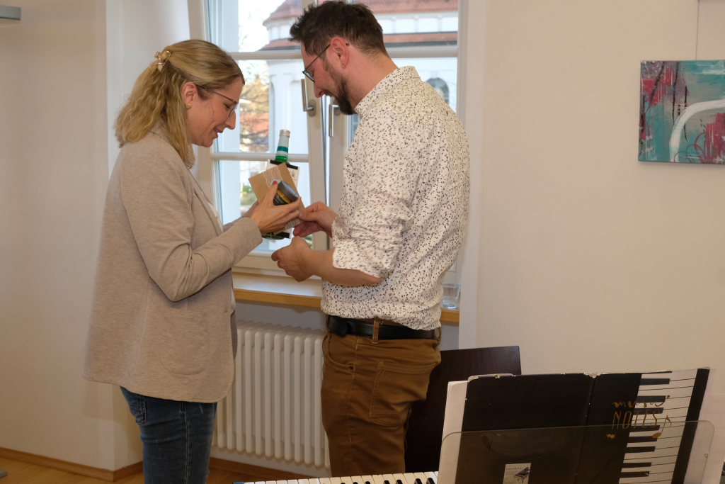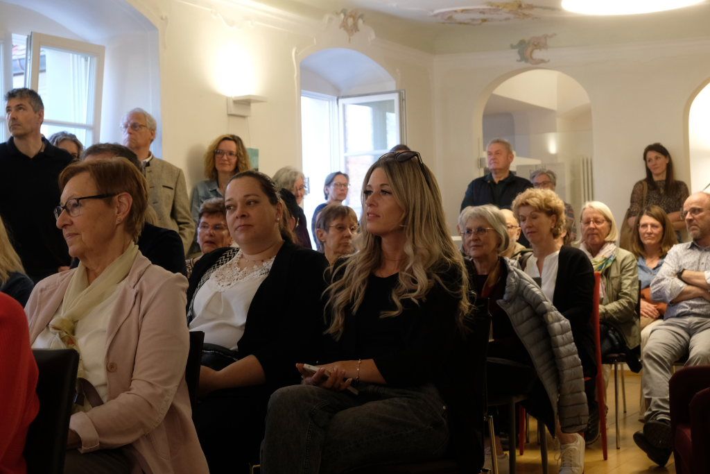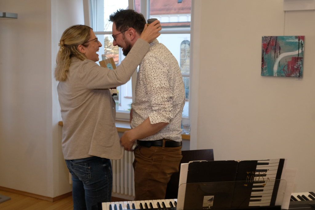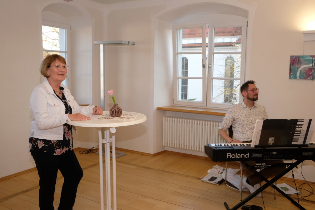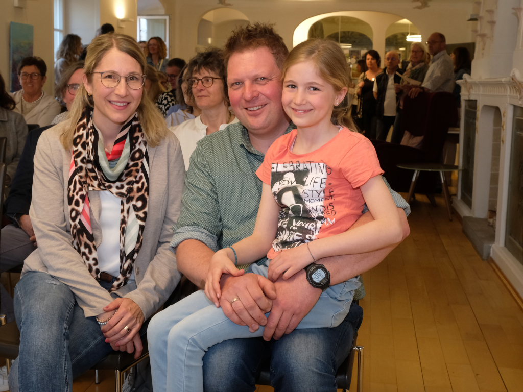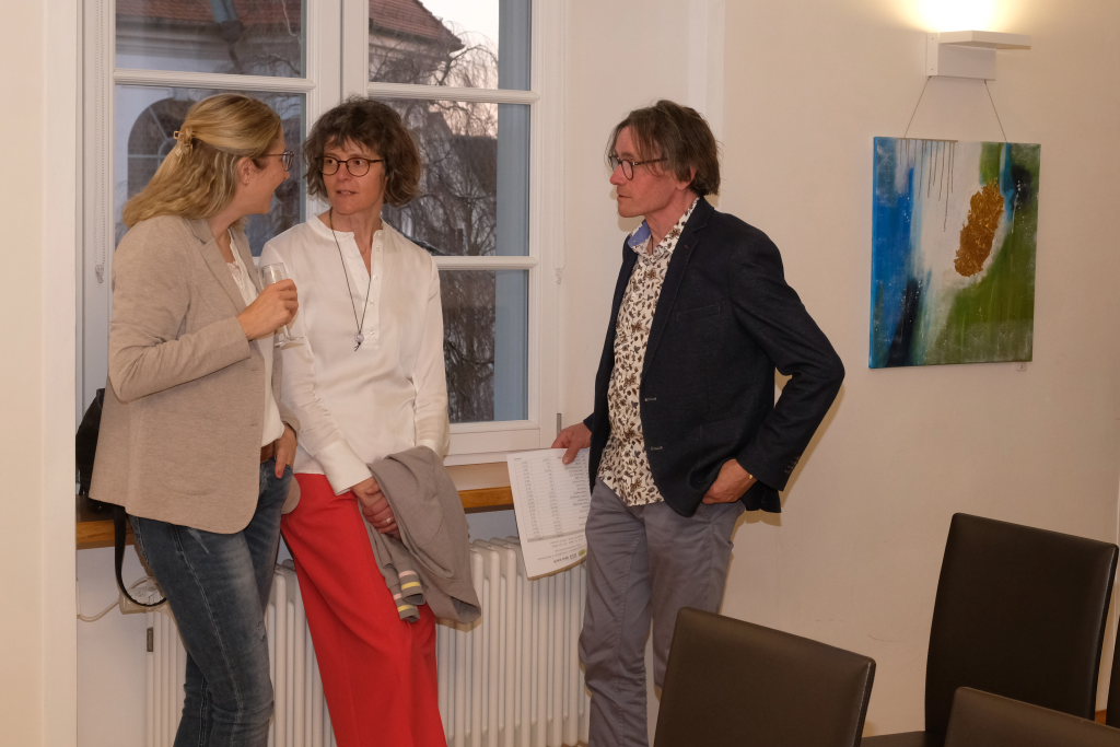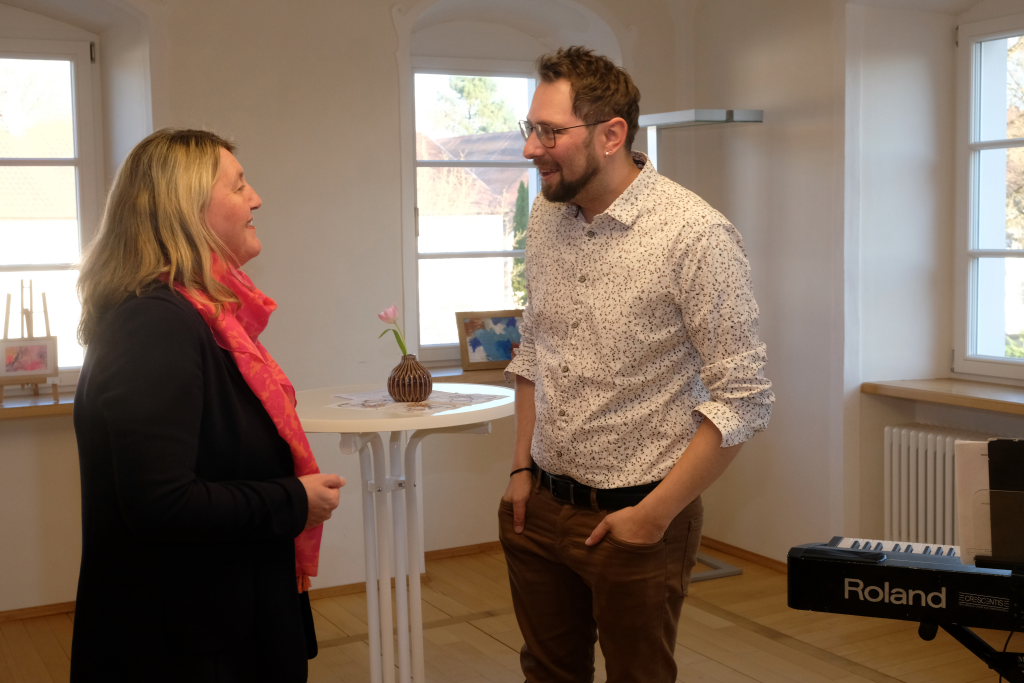 Am Ende ihrer Ansprache fand sie zahlreiche Worte des Dankes: Sie bedankte sich bei den Organisatorinnen der Ausstellungen, Christiane Linge und Doris Schäfer, sowie bei Bürgermeisterin Alexandra Scherer für die Möglichkeit, „in diesen tollen Räumlichkeiten ausstellen zu dürfen, die der Kunst einen so tollen Rahmen geben.“ Ein großer Dank ging auch an den Musiker Johannes Tress: „Du machst Kunst in einer anderen Form. Und lebst, was Du liebst.“ Bei ihrem Mann bedankte sie sich ebenfalls: „Ohne Dich würde ein Aufbau nie klappen.“ Und schließlich ging ein großes Dankeschön an die sehr vielen Besucher dieser Vernissage: „Danke an alle, die die heute nur wegen mir gekommen sind, das berührt mich wirklich sehr.“