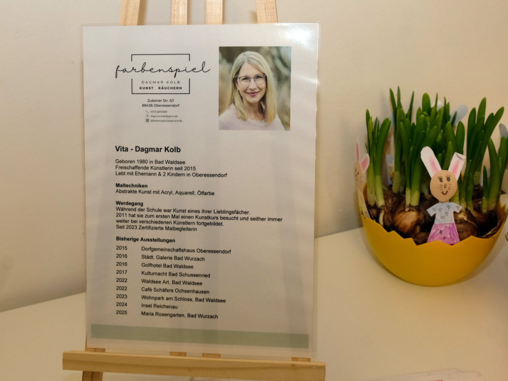 Für Dagmar Kolb, die in Haidgau aufwuchs und jetzt mit Ehemann Frank und zwei Kindern in Oberessendorf lebt und arbeitet, war Kunst bereits in der Schulzeit eines ihrer Lieblingsfächer. Seit sie im Jahre 2011 erstmals einen Kurs bei einem Künstler besucht hat, hat sie die Faszination der Malerei, die sie damals gepackt hat, nicht mehr losgelassen. Deswegen hat sie in den letzten Jahren immer wieder Kurse bei verschiedenen Künstlern besucht und dabei mit verschiedenen Techniken experimentiert.