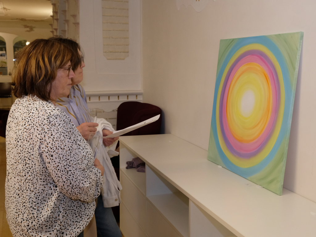 „Warum habe ich diesen Titel ‚Kunst ist jetzt‘ gewählt?“ fragte sie am Beginn ihrer Rede. Weil das was jetzt ist alleine zähle, nicht die Vergangenheit und nicht die Zukunft. Seit sie 2016 das letzte Mal in Bad Wurzach ausgestellt habe, habe sich viel in ihrer Kunst getan. Sie sei viel mutiger und freier in Farben und Formgebung geworden. „Ich liebe es, Neues zu kreieren und ein Bild entstehen zu lassen. Malen ist für mich Liebe.“