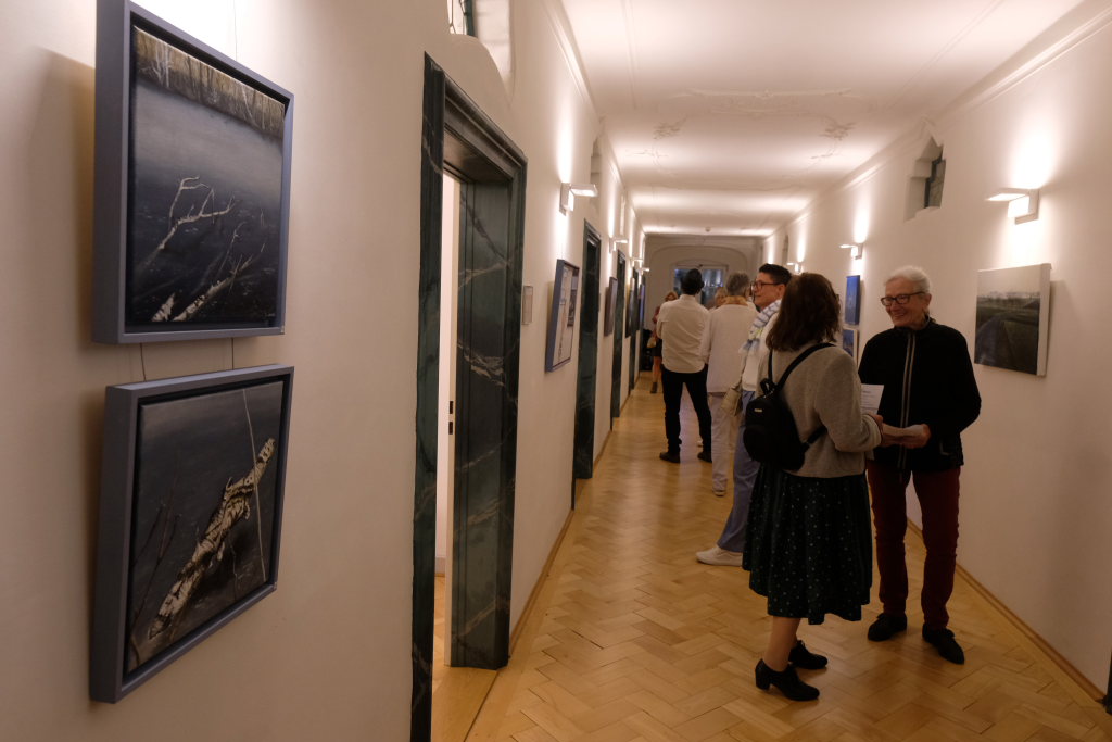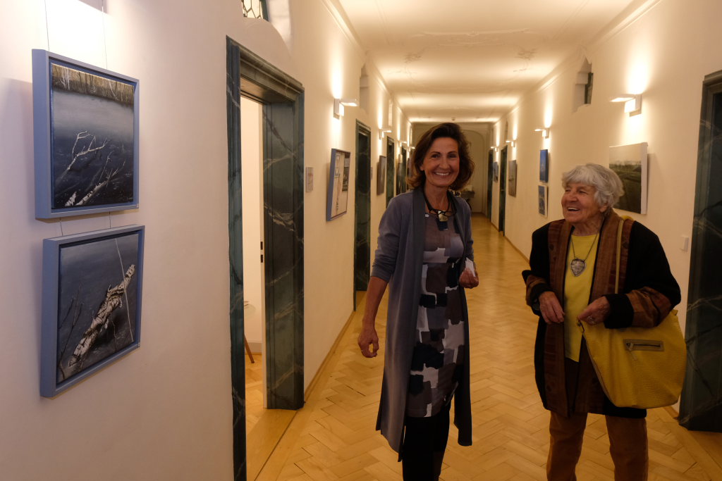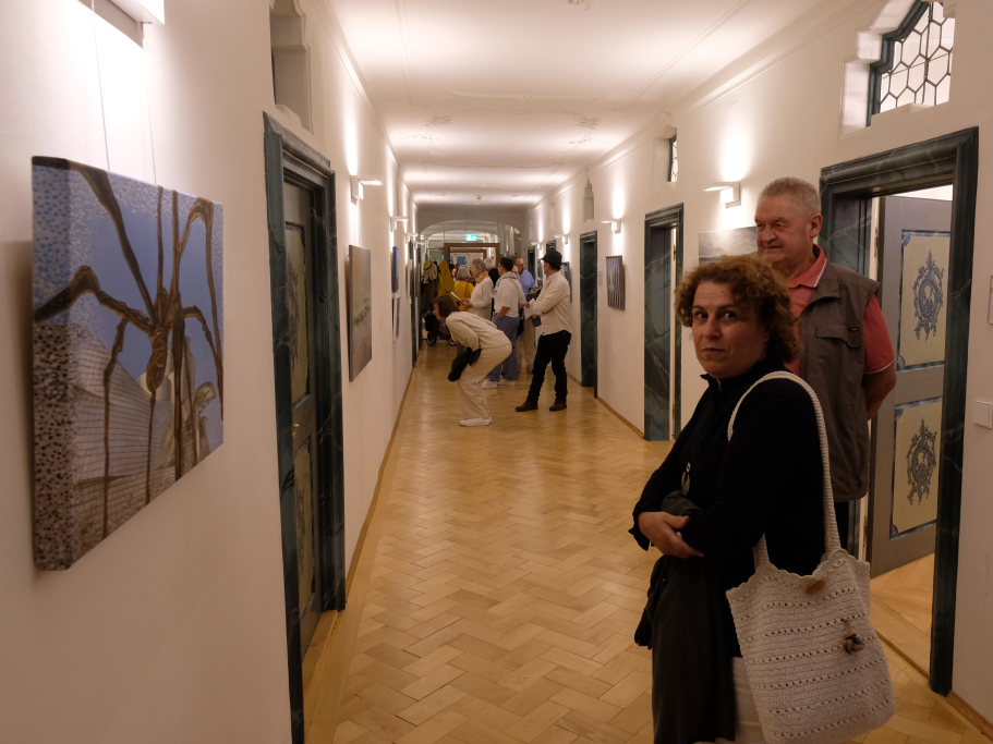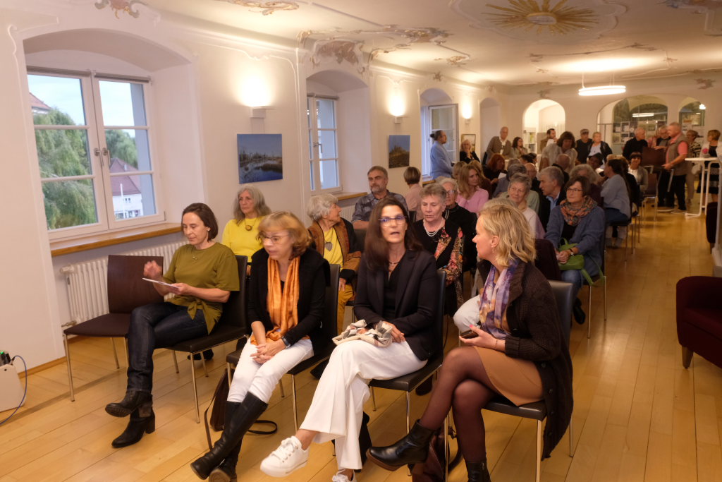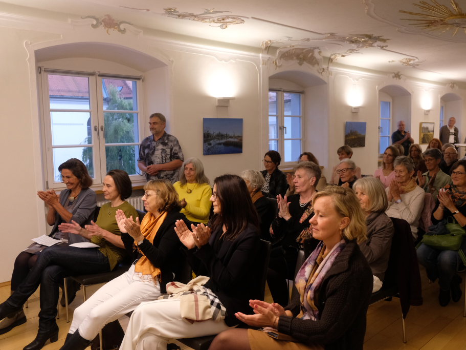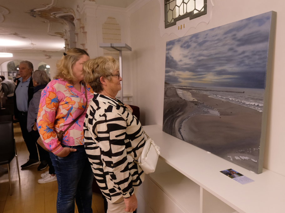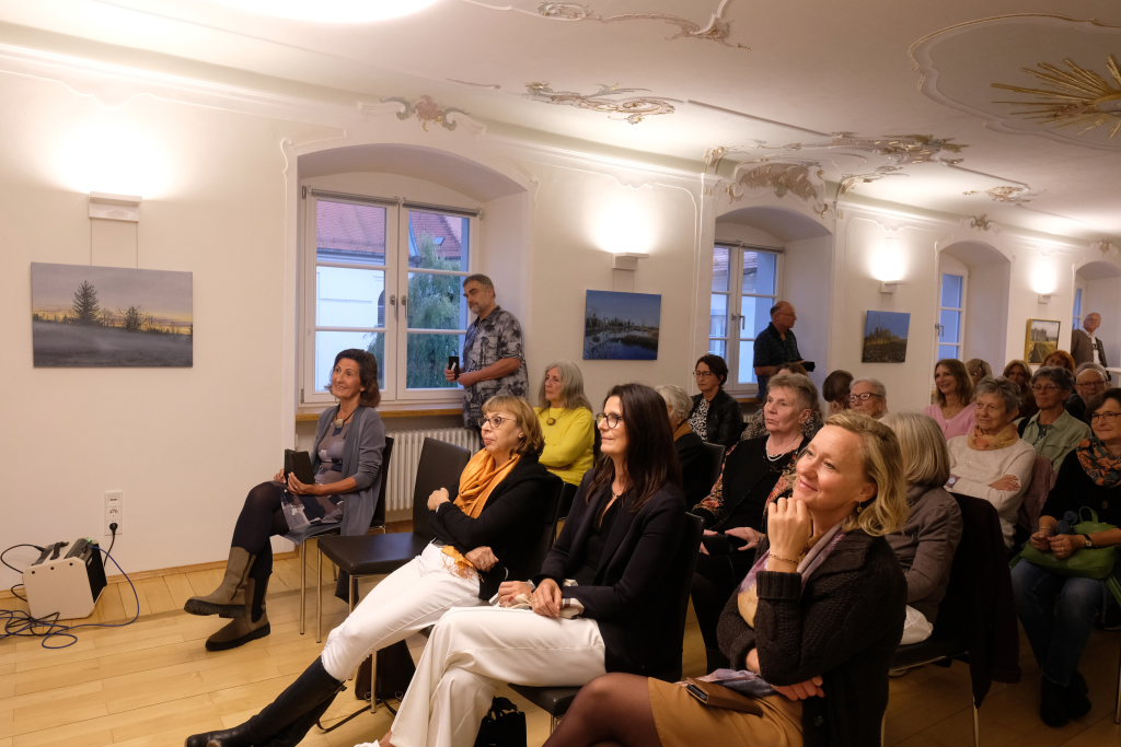 Aytner freute sich auch, dass so viele Besucher den Weg in den Kapitelsaal der Bücherei, der das Herzstück der Ausstellung bildet, gefunden hatten. „Denn Kunst zu betrachten ist zumindest für mich immer eine Möglichkeit, dem Alltag zu entfliehen und beim Eintauchen in eine andere Welt im Alltag innezuhalten und Kraft zu tanken.“ „Ohne Ausstellungen, fügte sie mit feiner Ironie hinzu, „würden Werke in Keller- oder Dachateliers ein unbeachtetes Dasein fristen. Das wäre sehr schade, denn nicht jedem ist Ruhm und Ehre nach Verlust eines Ohres post-mortem vergönnt.“