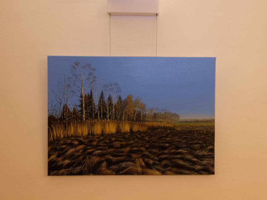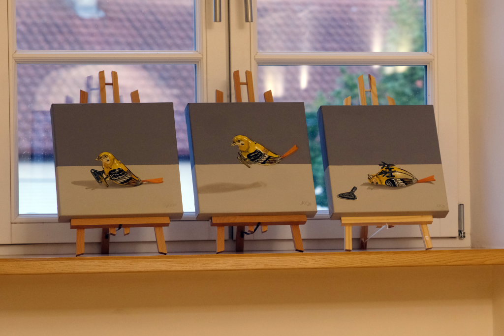 Das ließen sich die rund 70 Besucher nicht zweimal sagen und gingen auf die Erkundung der Ausstellung. Neben den bereits erwähnten Riedbildern gab es dabei auch viele – ebenso wie die Laudatio – mit viel Ironie gewürzte Bilder zu entdecken. Etwa das Triptychon des Spielzeugvogels, der nach dem Ablaufen seiner Feder alle „Viere“ von sich streckt. Oder das Eis schleckende Mädchen mit der „Langzunge“. Oder die Graffitis auf der Leinwand durch eine regennass-angelaufene Glasscheibe gesehen. Und daneben äußerst viele extrem detailreiche Landschaftsbilder.