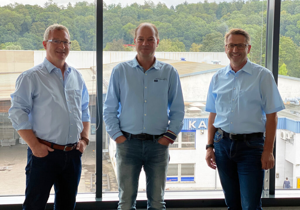 Die beiden Geschäftsführer Wolfgang Karger (links) und Uli Karger (Mitte) sowie Gerald Linder, Bereichsleiter Feuerverzinken, freuen sich über die geglückte Übernahme der MEGA Pulverbeschichtungen GmbH sowie die Wiederaufnahme des Betriebs in Bad Wurzach als Logistikzentrum. © Firmengruppe Karger