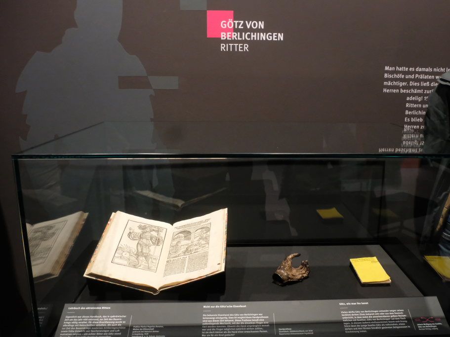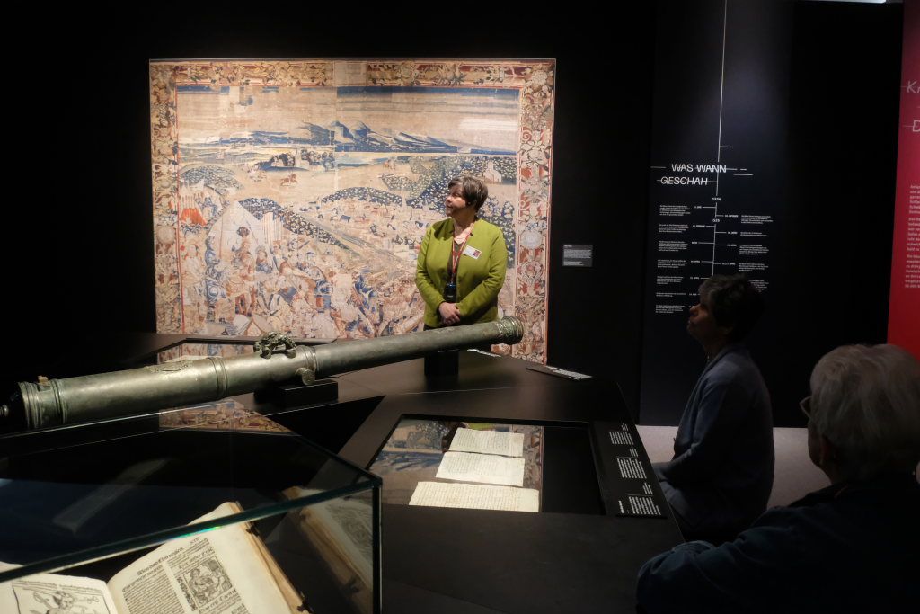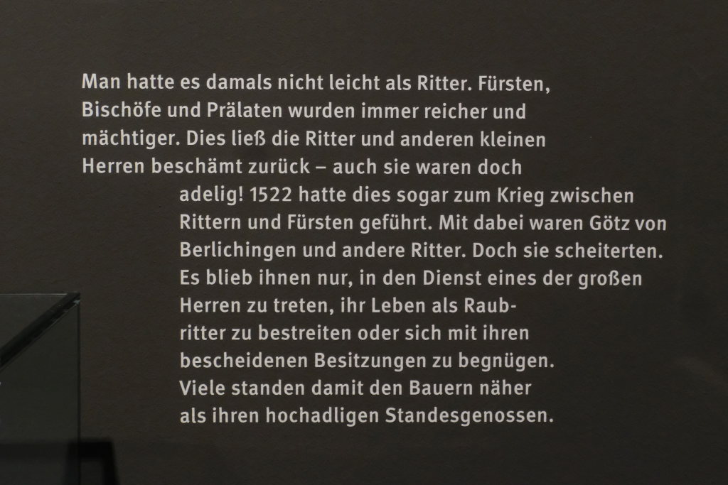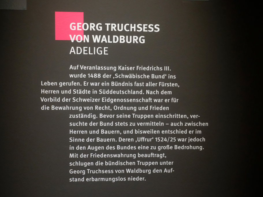 Wild vermittelte bei seiner kleinen Einstimmung auf die Ausstellung auch einen kleinen Blick auf den „Lohnzettel“ des Bauernjörg. Dieser erhielt für seine Dienste die enorme Summe von 1.000 Gulden im Monat, während ein Pfarrer 600 Gulden im Jahr erhielt, ein Landsknecht gar nur vier Gulden im Monat. Aber er musste auch finanziell in Vorleistung gehen, weil er nur ein Drittel seines Bugdets vom Schwäbischen Bund erhielt. Und der Schwäbische Bund holte sich das investierte Geld von den Bauern zurück: Zahlen oder Brandschatzung waren deren Alternativen.