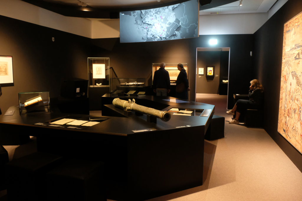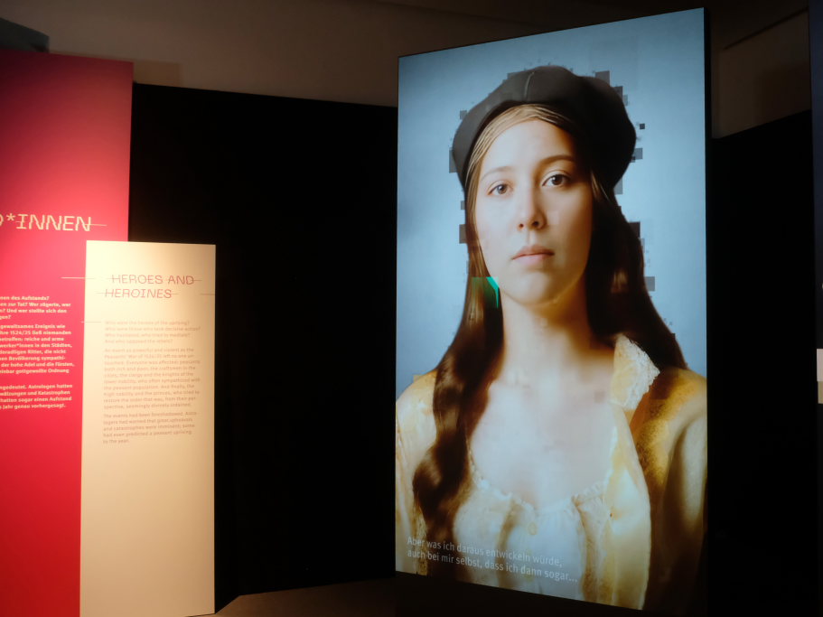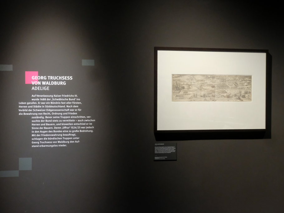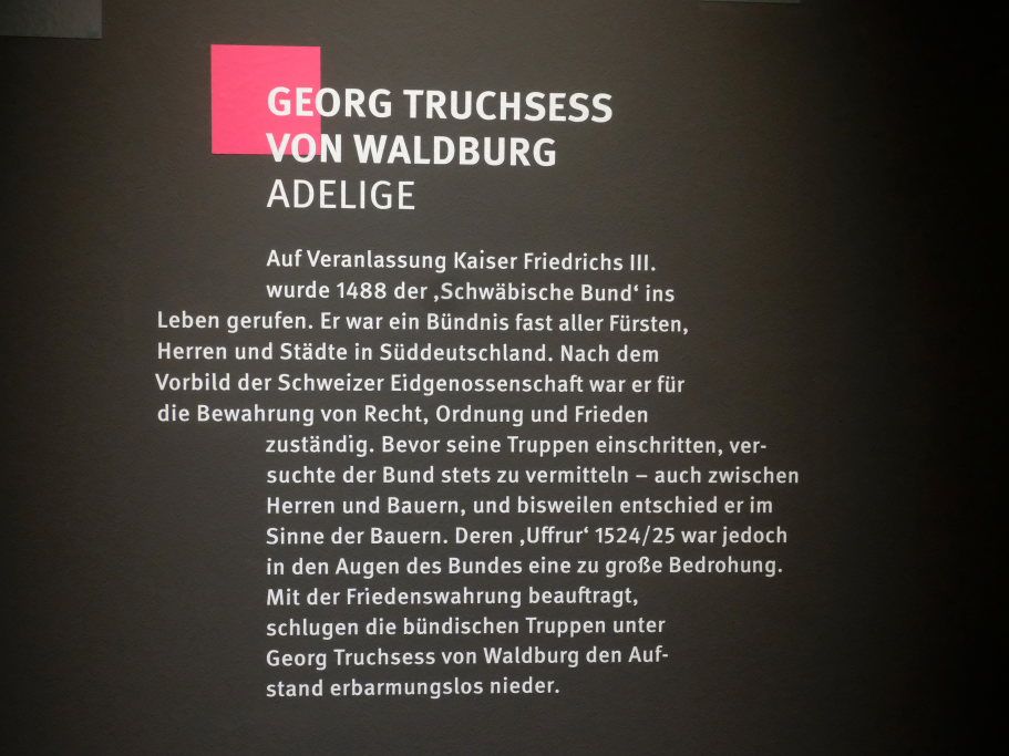 Einige der KI animierten Figuren, die zu Wort kommen, waren Künstler oder Kürschner, also Handwerker, aber auch Bäuerinnen und Leibeigene kamen zu Wort. Auch der in einem anderen Zusammenhang zu Berühmtheit gelangte fränkische Ritter Götz von Berlichingen (der mit der eisernen Faust und dem liebevollen Zitat) kämpfte einige Zeit auf Seiten der Bauern, gegen seinen Willen, wie er später behauptete. Es kamen aber auch Personen der Gegenseite zu Wort. So der Abt des Klosters Weißenau, Jakob Murer, der den Anliegen der Bauern durchaus mit Verständnis begegnete, aber die alte Ordnung verteidigte. Ihm hat die Nachwelt die Murer Chronik zu verdanken, die er über den Bauernkrieg anfertigen ließ. Dessen zentrale Figur war Georg Truchsess von Waldburg, genannt der Bauernjörg, ein Adliger und Feldherr, der vom „Schwäbischen Bund“, einem Zusammenschluss von Fürsten, Adligen und Reichsstädten den Auftrag erhalten hatte, den Aufstand niederzuschlagen. In der Kommandozentrale, dort wo ein Artillerie-Geschütz und eine Hakenflinte im zweiten Obergeschoss des Klosters ausgestellt sind, erzählt der Bauernjörg, wie er in der Schlacht von Böblingen gegen die Aufständischen vorging.