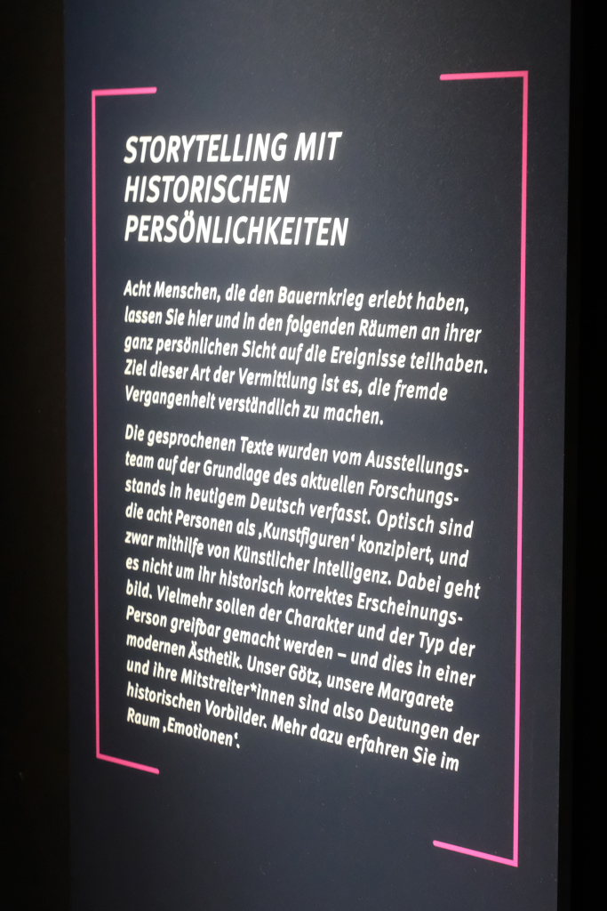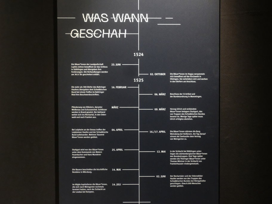 Ein verzerrtes Bild hatten wohl auch einige Besucher aus dem Ballungsraum der Landeshauptstadt, die sich bei der Führerin negativ darüber äußerten, dass die Ausstellung aus ihrer Sicht „in der Pampa“ stattfindet. Anstelle sich der Region bewusst zu werden, wo damals die Brennpunkte des Bauernkrieges waren.