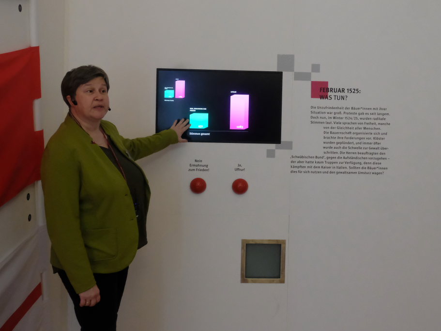 Mit zwei Umfragebuzzern möchten die Ausstellungsmacher feststellen, wie die Besucher auf das Gesehene und Gehörte reagieren. Reden und Verhandeln oder Uffrur! sind dabei die Alternativen. Für die einzelnen Personen, die im Laufe des Rundganges zu Wort kamen, konnten die Besucher Sympathiepunkte vergeben. Dass dabei der Bauernjörg sehr schlecht wegkam ,war der doch einseitigen Darstellung der Ausstellungsmacher geschuldet, die ihn nur als brutalen Heerführer präsentierten und damit die Ambivalenz der Figur nicht gerecht wurde. Denn Stadtarchivar Michael Wild hatte in seinem Vortrag diese Ambivalenz gut herausgearbeitet. Vielleicht lag es auch daran, dass die Historiker und Kunsthistoriker in Stuttgart nicht den Zugriff auf bestimmte Quellen hatten, die dieses Bild ein wenig hätten entzerren können.