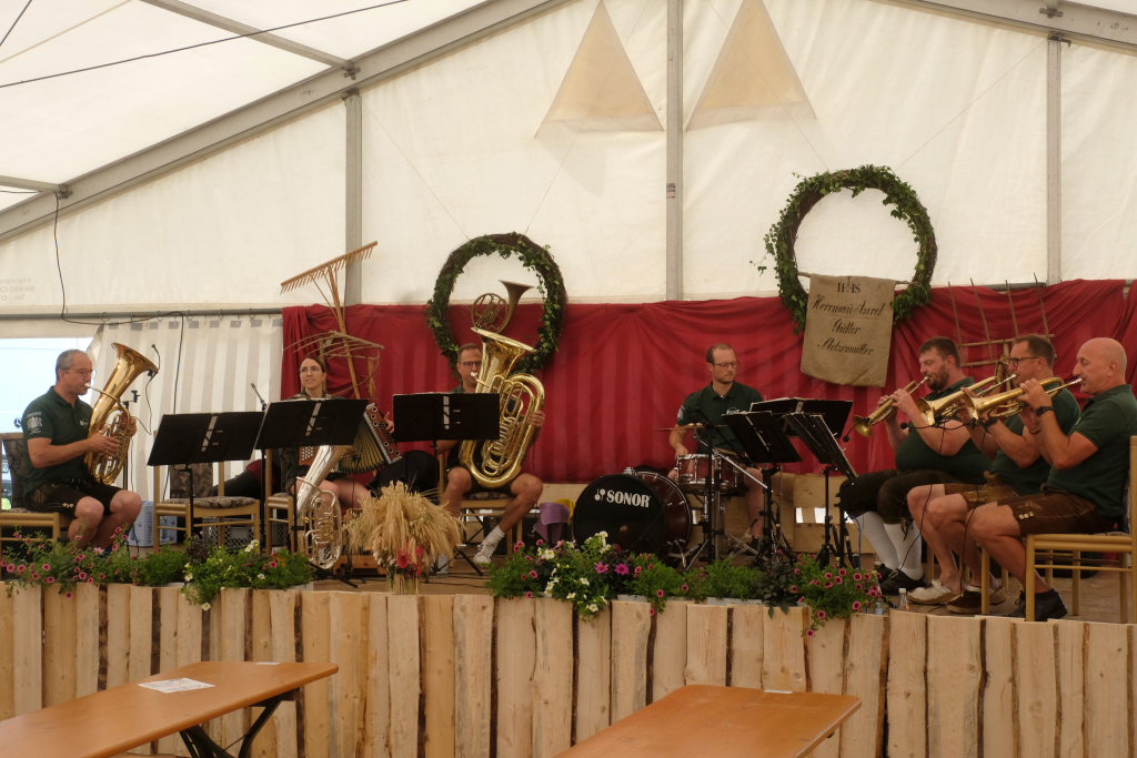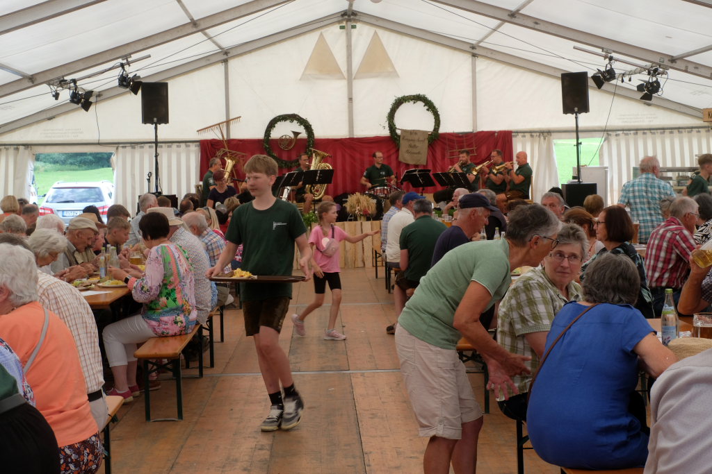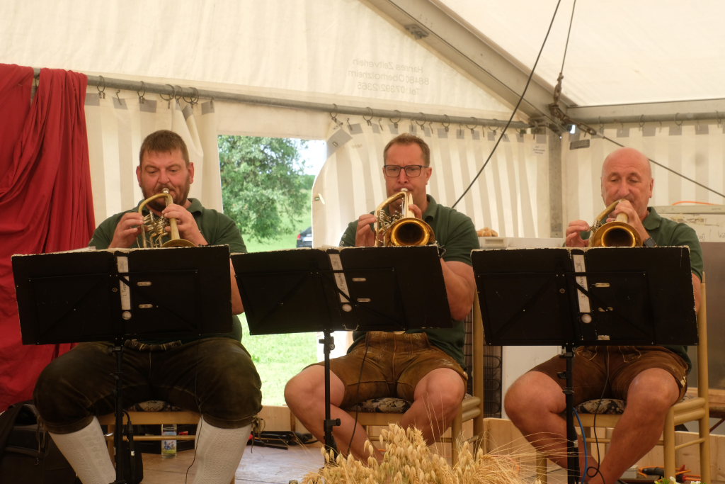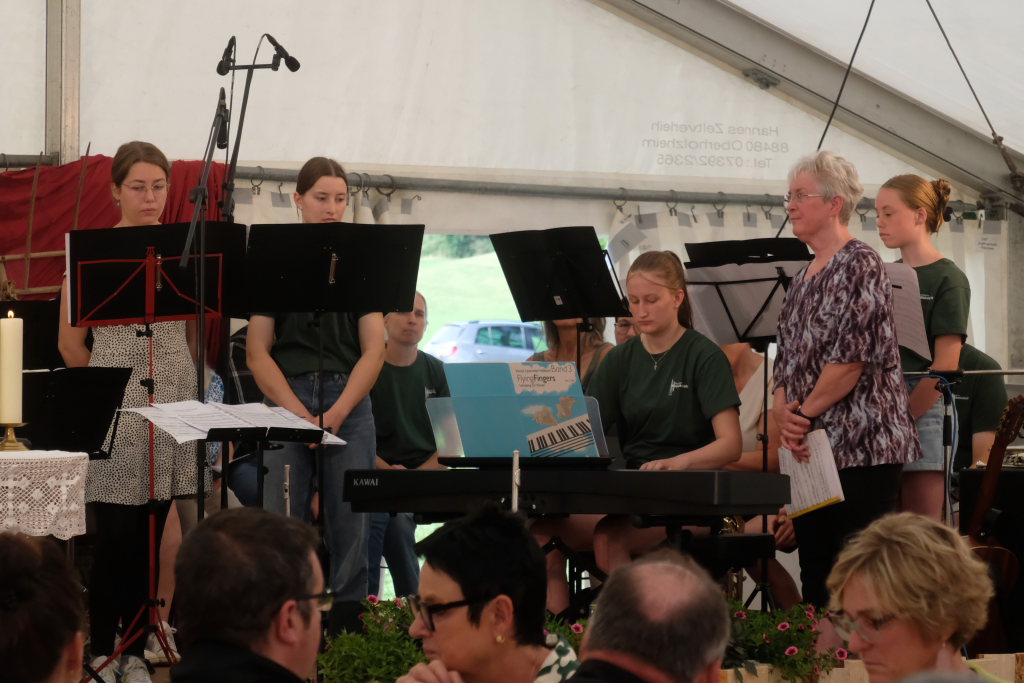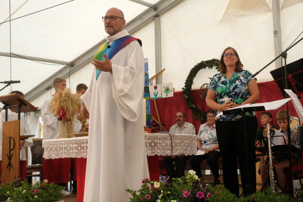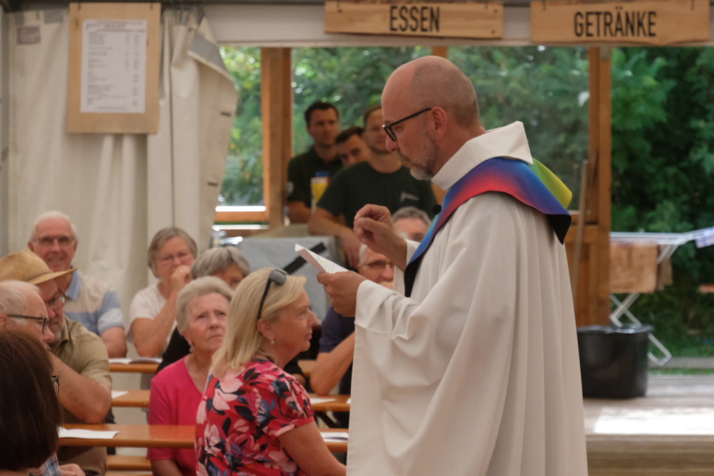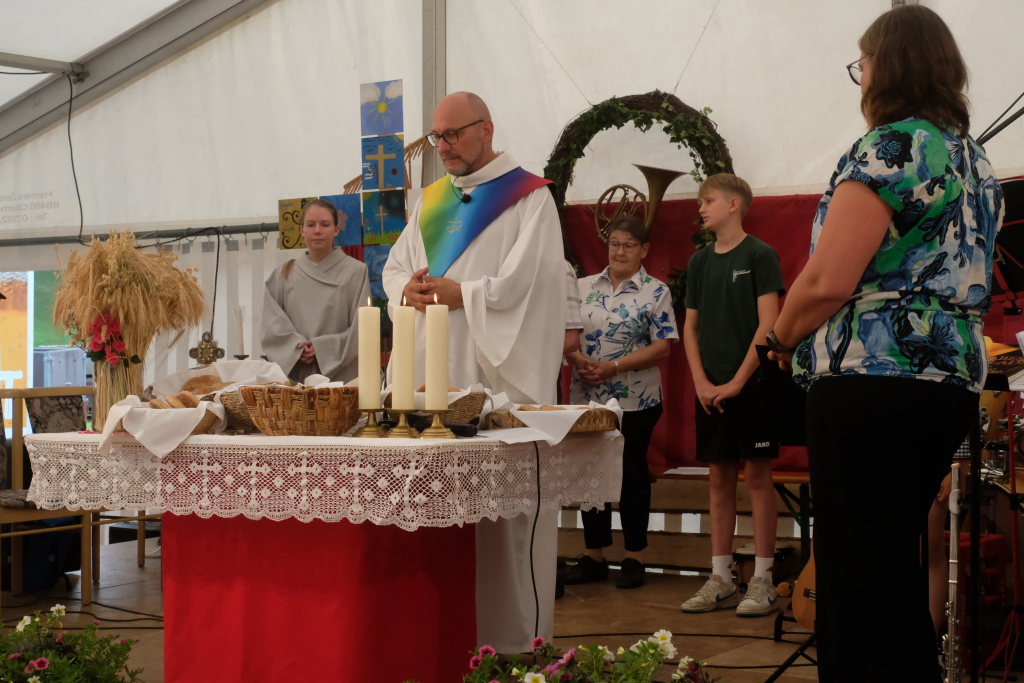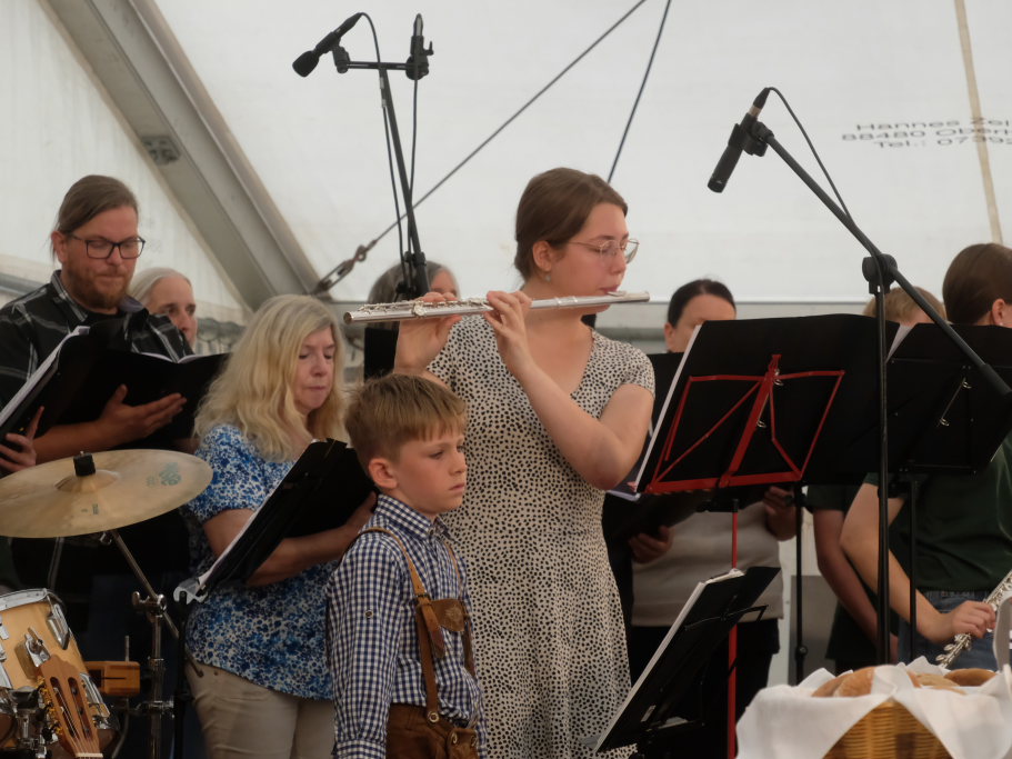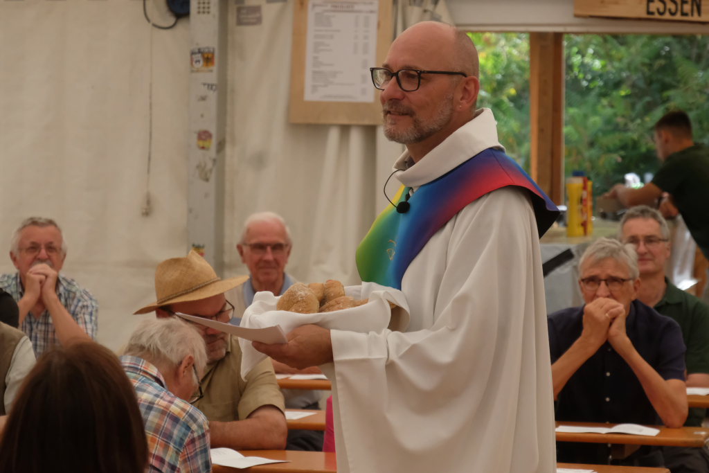 Doch die Nacht wurde für die „Schaffer“ des Musikvereines nur kurz, musste doch der Zeltgottesdienst und der Frühschoppen am Sonntagmorgen noch vorbereitet werden. Dieser wurde von Pastoralreferent Matthias Winstel von der Seelsorgeeinheit Bad Wurzach zelebriert, musikalisch unterstützt von einem Instrumentalensemble und einem Projektchor der Kirchengemeinde. Anstelle der Kommunion verteilte Winstel eigens von Bäcker Schneider in Haidgau gebackenes Brot unter den Gottesdienstbesuchern, das diese miteinander brechen durften und dabei möglichst viel miteinander reden sollten.