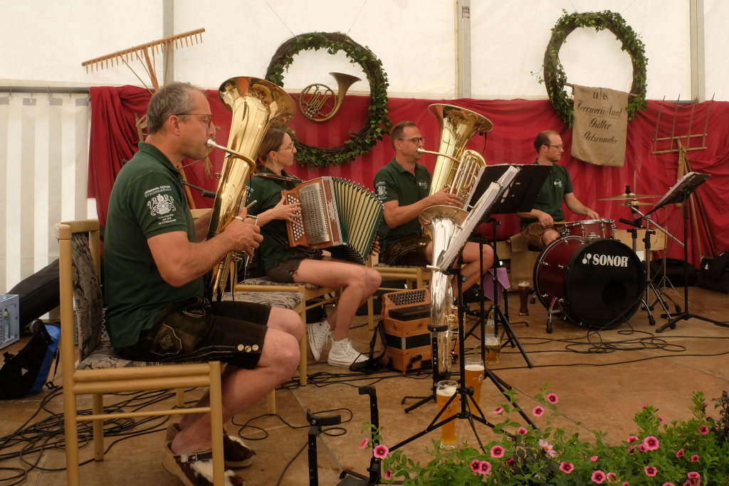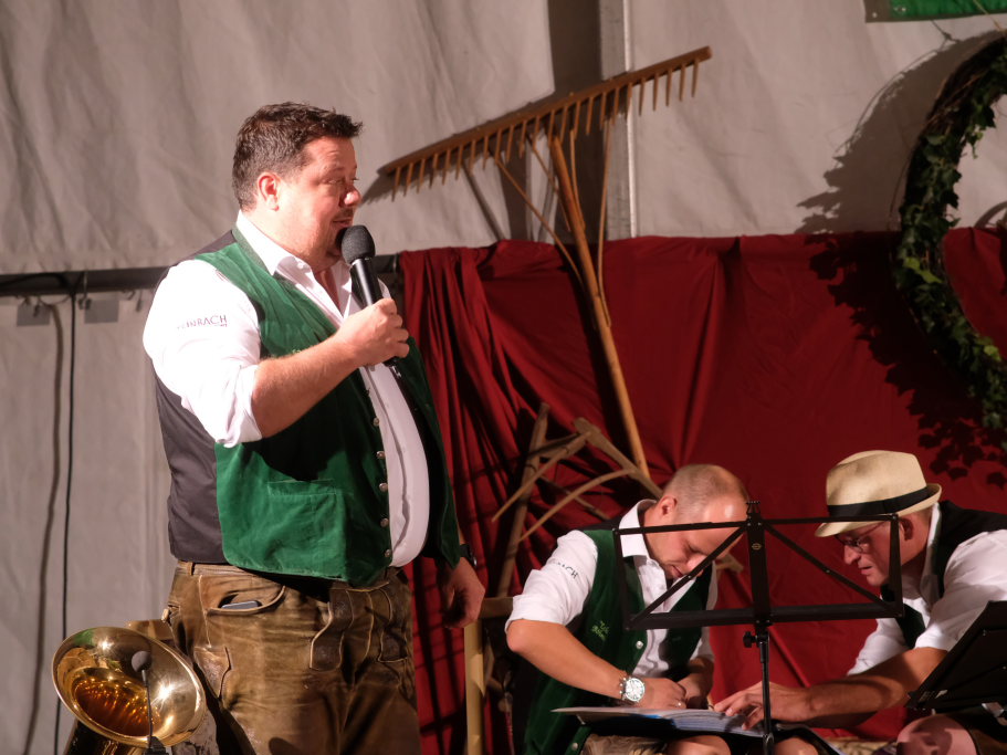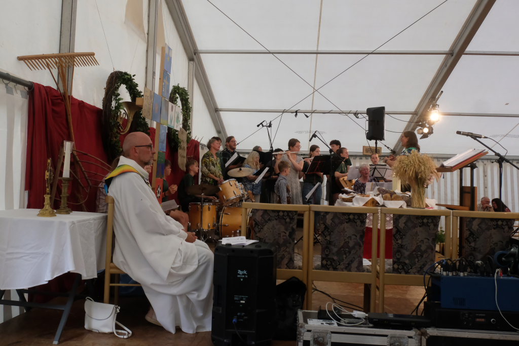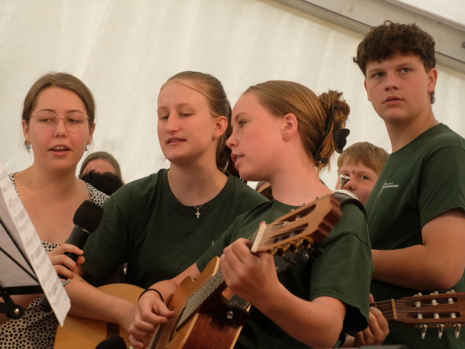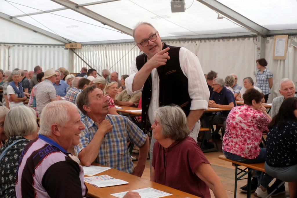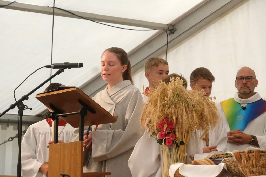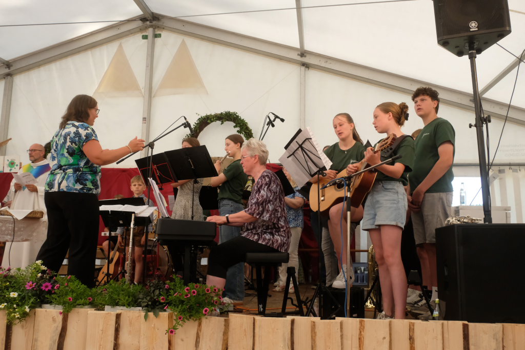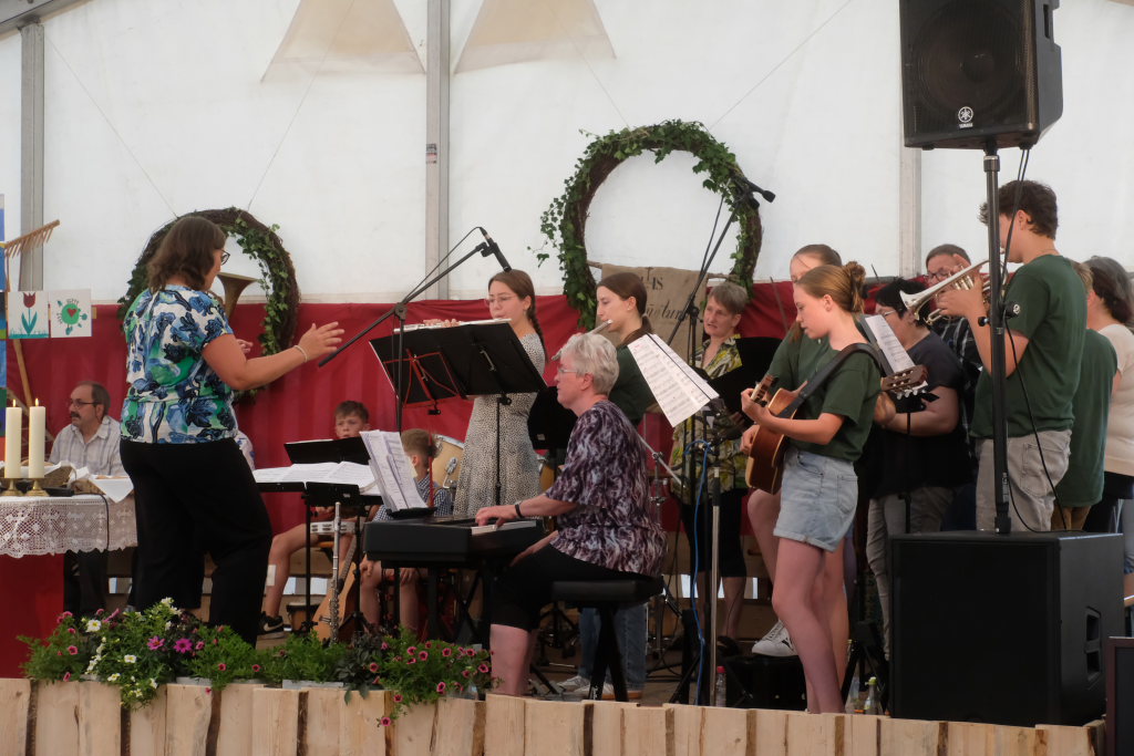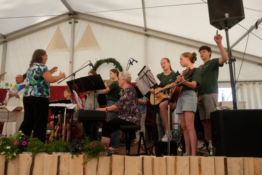 Doch die Nacht wurde für die „Schaffer“ des Musikvereines nur kurz, musste doch der Zeltgottesdienst und der Frühschoppen am Sonntagmorgen noch vorbereitet werden. Dieser wurde von Pastoralreferent Matthias Winstel von der Seelsorgeeinheit Bad Wurzach zelebriert, musikalisch unterstützt von einem Instrumentalensemble und einem Projektchor der Kirchengemeinde. Anstelle der Kommunion verteilte Winstel eigens von Bäcker Schneider in Haidgau gebackenes Brot unter den Gottesdienstbesuchern, das diese miteinander brechen durften und dabei möglichst viel miteinander reden sollten.
