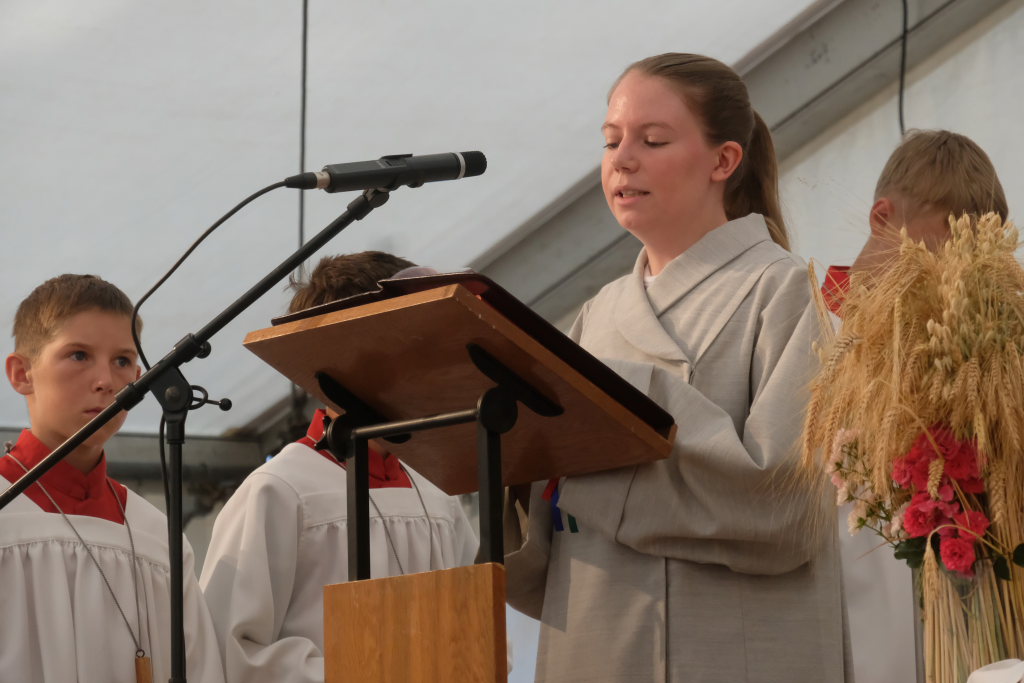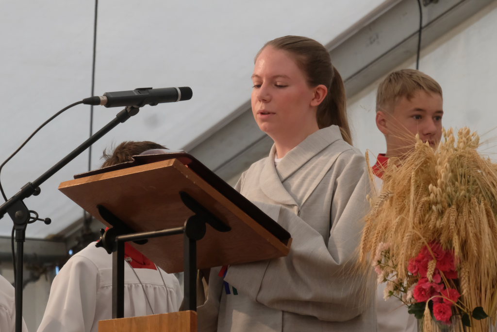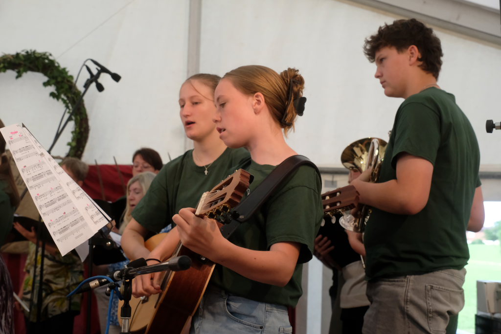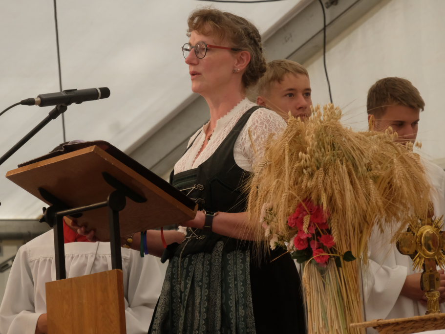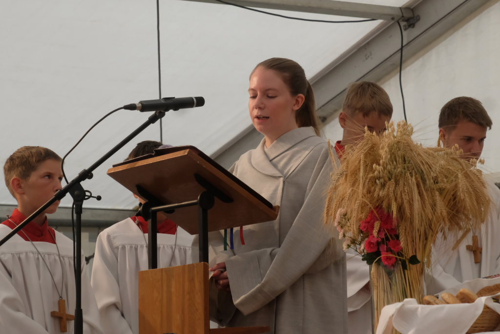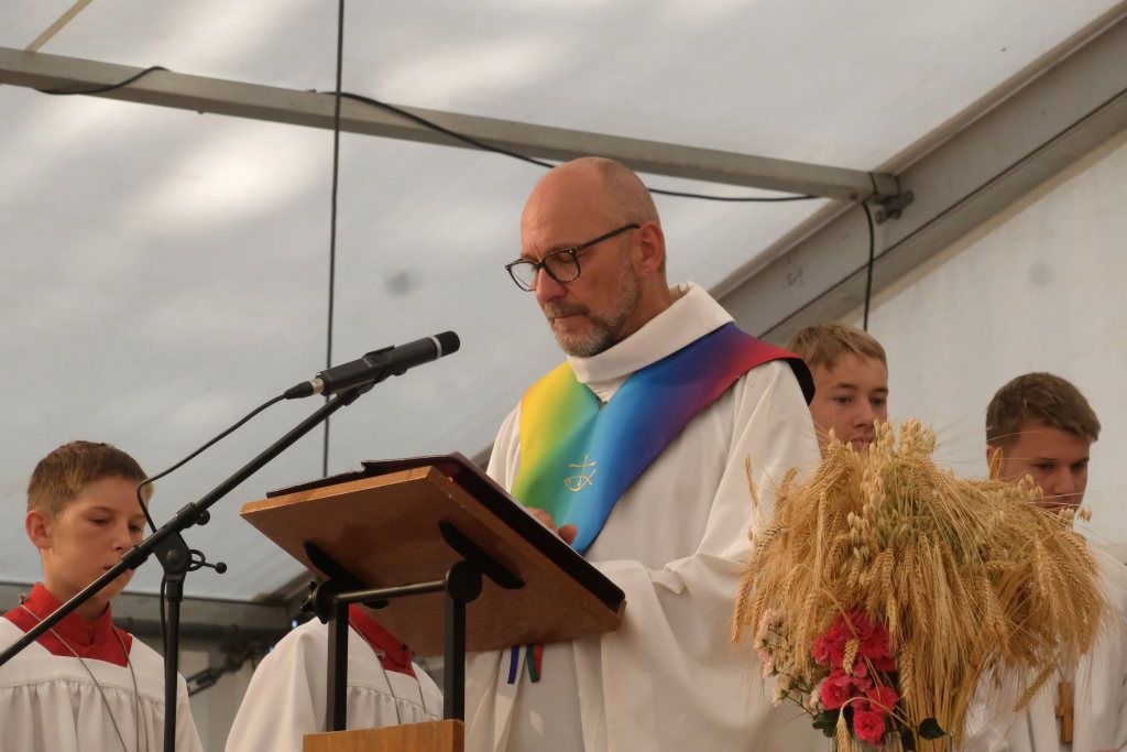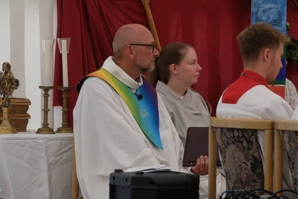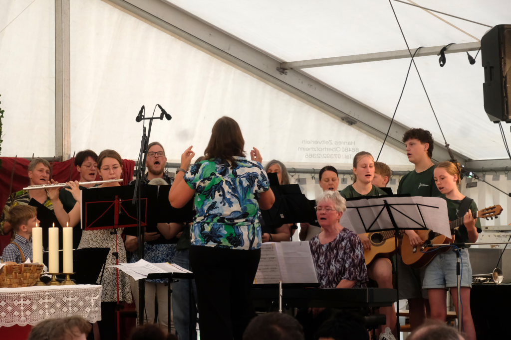 Doch die Nacht wurde für die „Schaffer“ des Musikvereines nur kurz, musste doch der Zeltgottesdienst und der Frühschoppen am Sonntagmorgen noch vorbereitet werden. Dieser wurde von Pastoralreferent Matthias Winstel von der Seelsorgeeinheit Bad Wurzach zelebriert, musikalisch unterstützt von einem Instrumentalensemble und einem Projektchor der Kirchengemeinde. Anstelle der Kommunion verteilte Winstel eigens von Bäcker Schneider in Haidgau gebackenes Brot unter den Gottesdienstbesuchern, das diese miteinander brechen durften und dabei möglichst viel miteinander reden sollten.