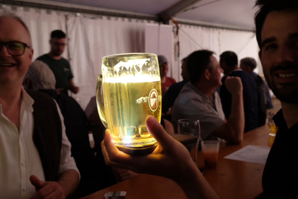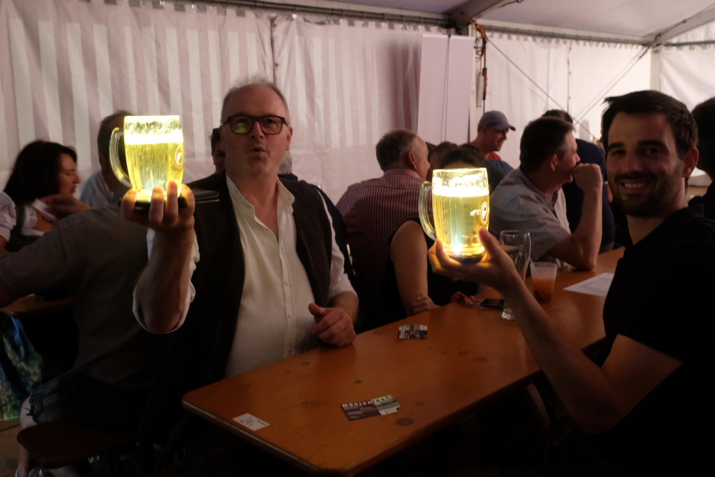 „Hausherr“ Hermann Gütler war, wie das fachkundige Publikum, begeistert von dem auf der Bühne Dargebotenen und hatte zwischendurch auch noch Zeit – wenn man eh schon das Handy in der Hand hatte – leuchtende Bierkrüge zu „erfinden“. Bestens mit Essen und Trinken versorgt, wurde auch dieser Abend zum reinen Genuss.