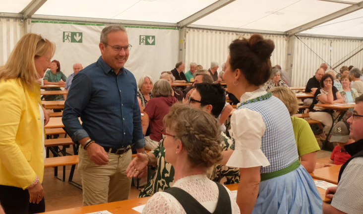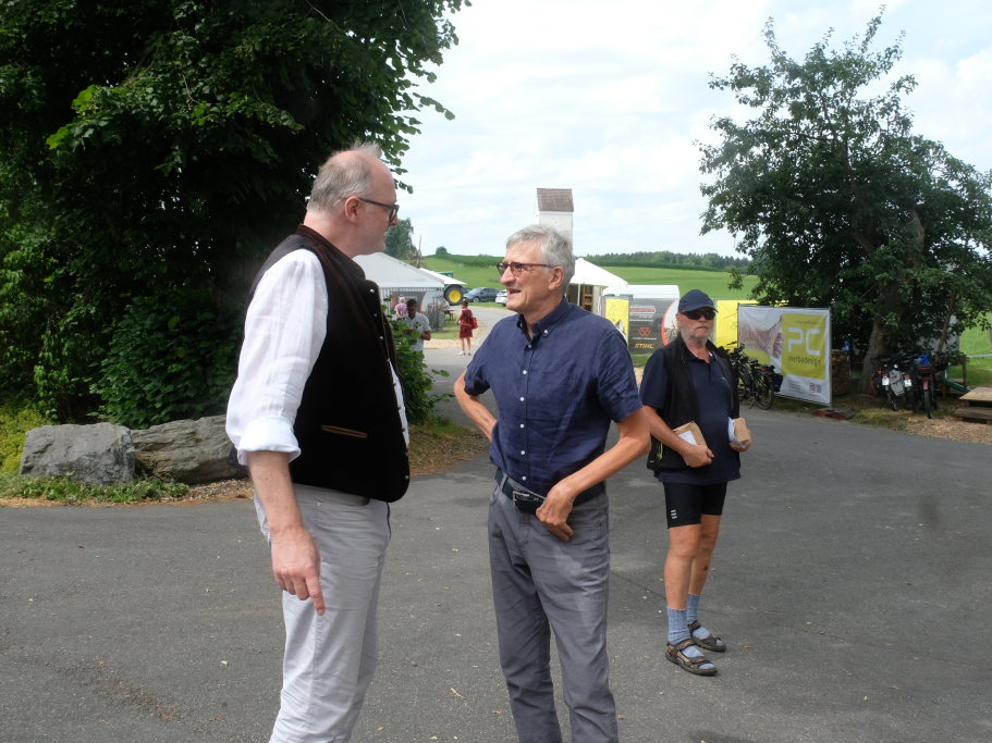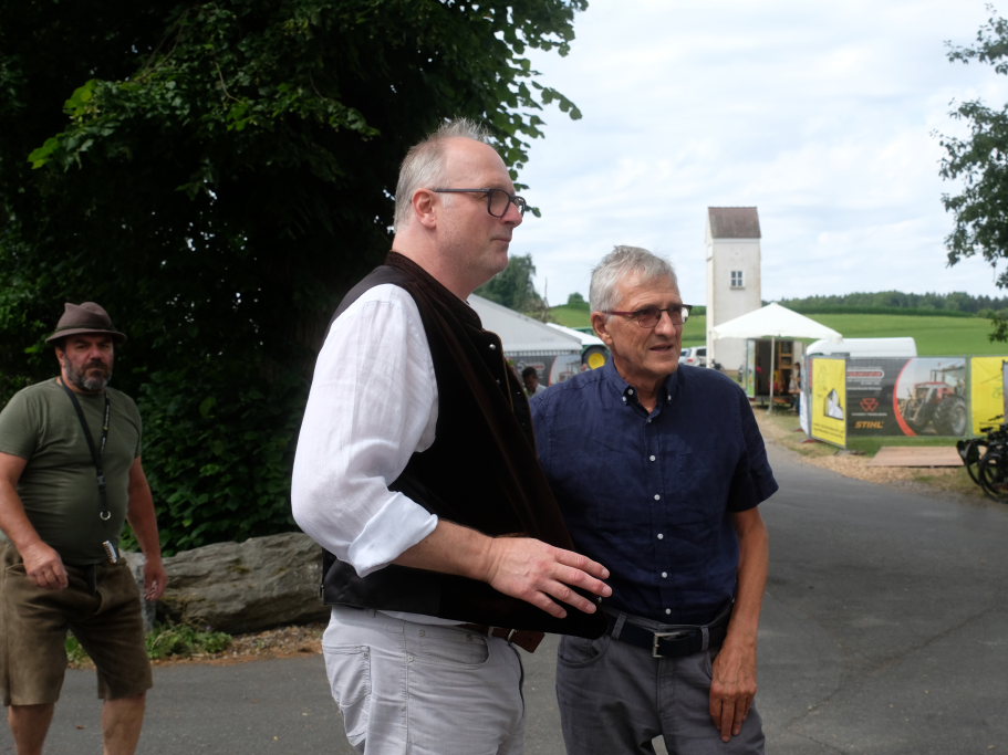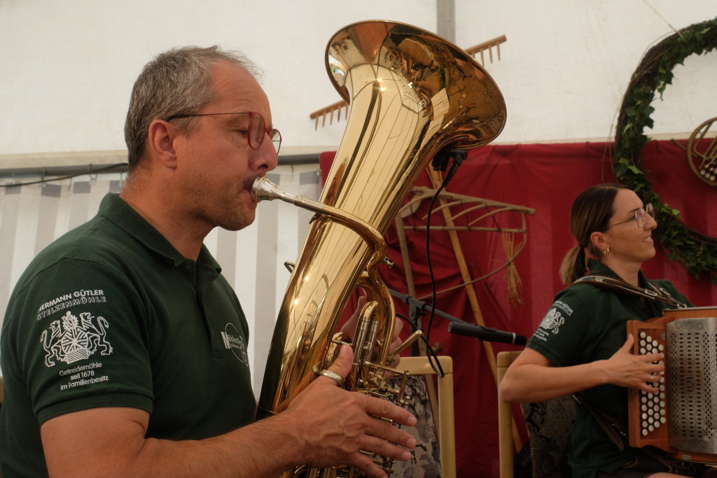Pünktlich zur Eröffnung des Frühschoppens, den die Mühlenfest-Musikanten gestalteten, betrat hoher Besuch das Festzelt: MdL Raimund Haser war aus Immenried herübergekommen, um sich ein Bild von der Lage der Getreide- und Landwirtschaft zu verschaffen. Denn im Mühlengebäude nebenan informierten – natürlich – die Müller, aber auch andere Landwirtschaftsverbände sowie der Landkreis Ravensburg über verschiedene aktuelle Themen, aber auch über Ausbildungsmöglichkeiten. Denn auch das Müllerhandwerk leidet, wie die meisten Handwerksbranchen unter Nachwuchsmangel. „Versüßt“ wurde dieser Mini-Tag-der-offenen-Tür durch verschiedene Versucherle an frischen Backwaren.