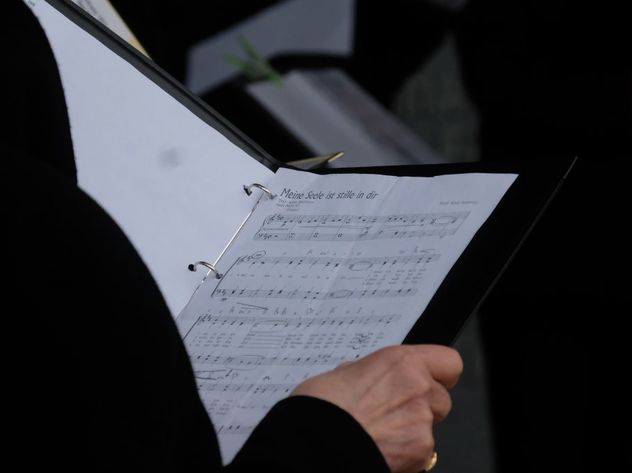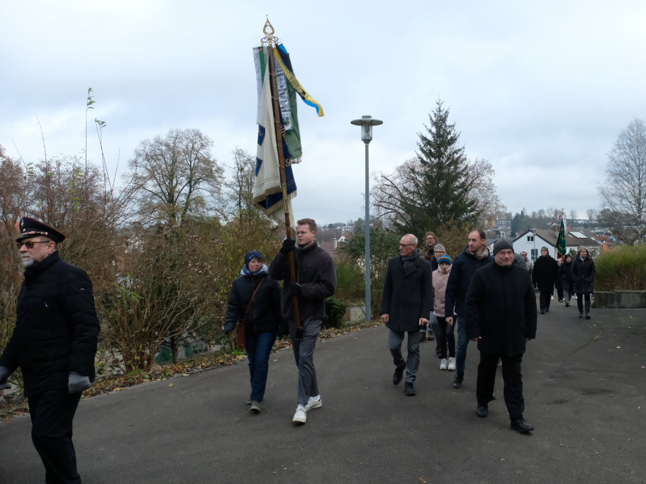 Die Stadtkapelle, die gemeinsam mit dem Liederkranz Chorioso den musikalischen Part der Gedenkveranstaltung bestritt, eröffnete die Feier musikalisch mit einem Choral, während die Fähnriche der teilnehmenden Vereine ihre Fahnen zum Gedenken an die Toten senkten.
