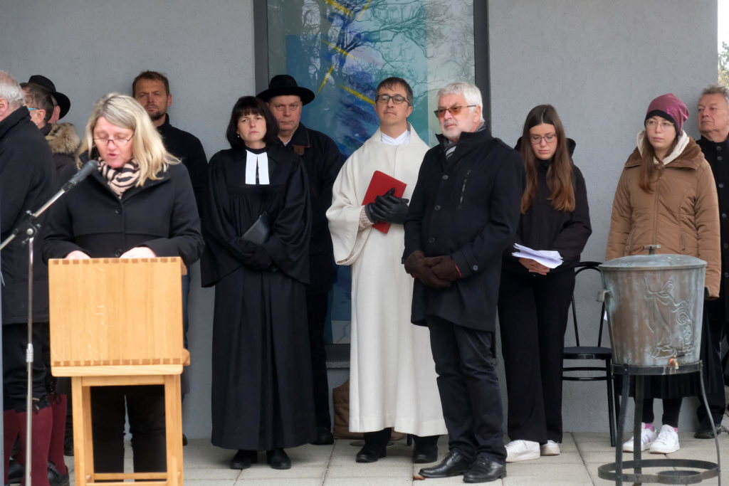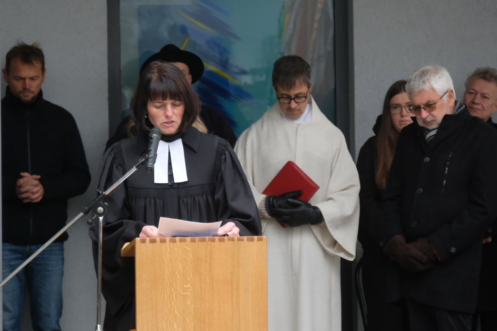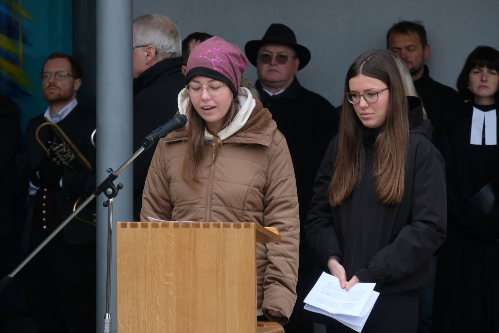 Pfarrerin Cora Boettiger und Pastoralreferent Raimund Miller waren mit ihren Gebeten für Frieden und Freiheit für den kirchlichen Teil der Feier zuständig. Boettiger bat in ihrem Gebet darum, dankbar zu sein für alle Gesten der Versöhnung nach den beiden Weltkriegen. Und auch das Gedenken an die Opfer der Konzentrationslager ebenso wie das der Widerstandskämpfer weiterhin hochzuhalten. „Gib uns die Kraft, öffentlich und mit Zivilcourage gegen Unrecht und Lüge aufzutreten.“ „Wir bitten Dich für einen gerechten Frieden für alle Menschen im Nahen Osten, in der Ukraine und in den vielen weniger beachteten Kriegsgebieten der Welt.“ Raimund Miller betete für die Menschen von Verfolgung und Terror, dass sie diese überstehen und ihr Leben neu aufzubauen vermögen. Er betete für alle, die für die Menschlichkeit arbeiteten, die Gewalt abbauen und Frieden aufbauen helfen.