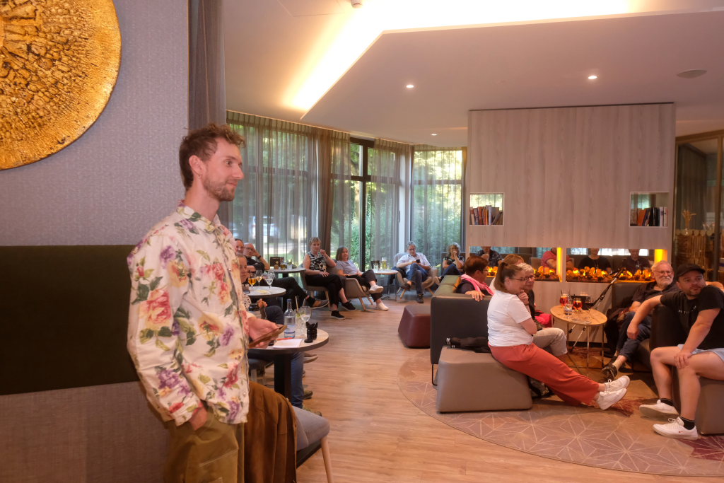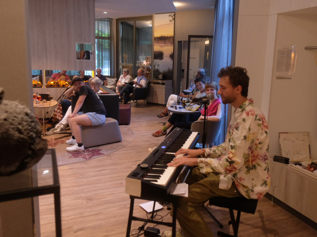 Bad Wurzach – der Musiker Edward Bailhache aus Jersey trat im Rahmen seiner Deutschland-Tour auch in Bad Wurzach auf. Bis Mitte Oktober tourt er durch 50 deutsche Städte. Zu dem Konzert im Barbereich des Bad Wurzacher Hotels FeelMoor kamen an diesem Montagabend, dem 25. August, zahlreiche Mitglieder des Partnerschaftsvereins.
