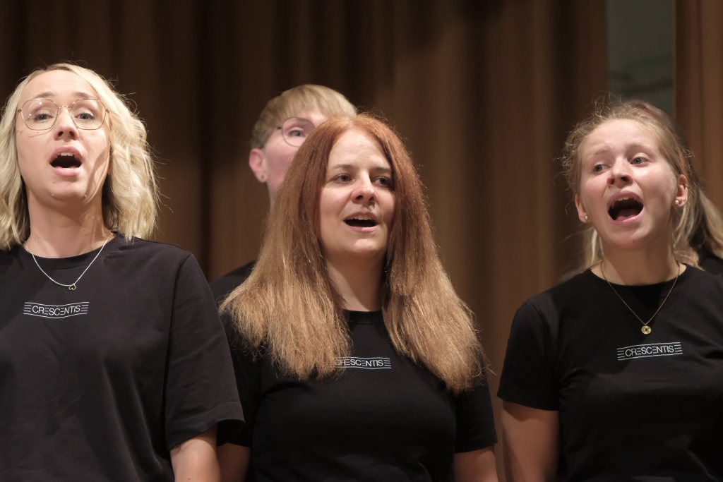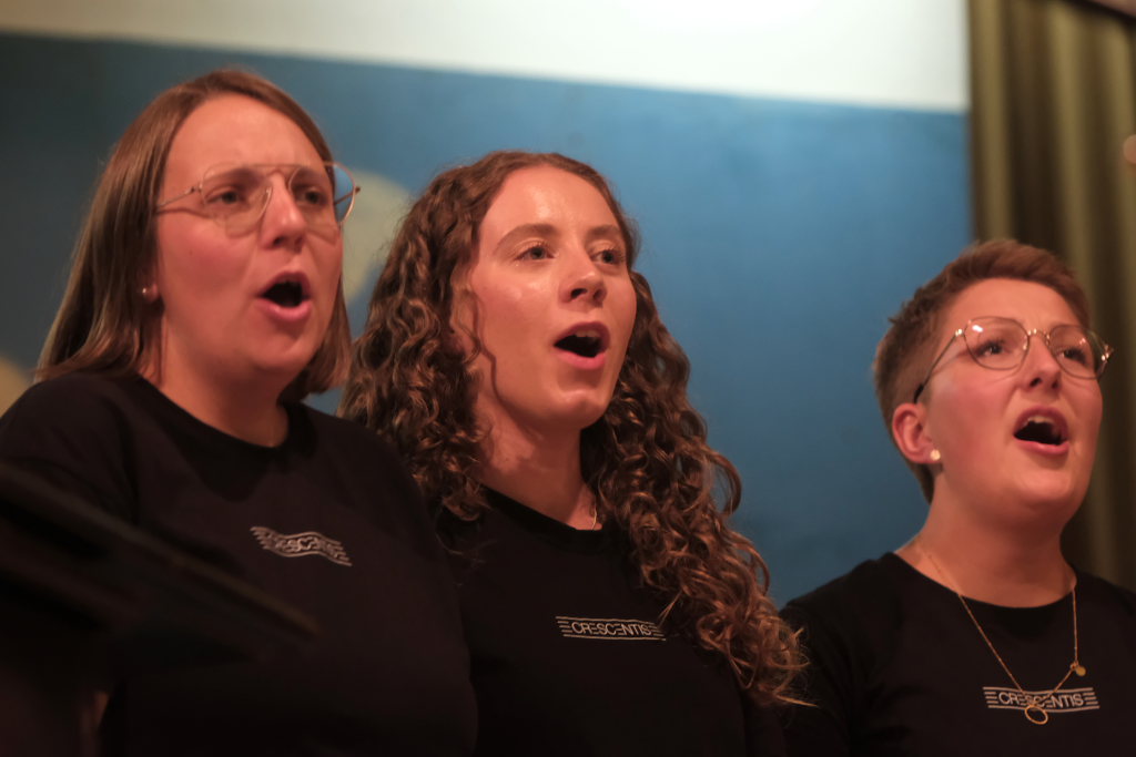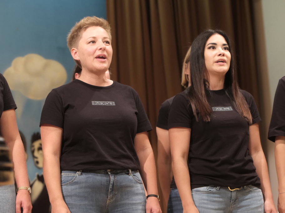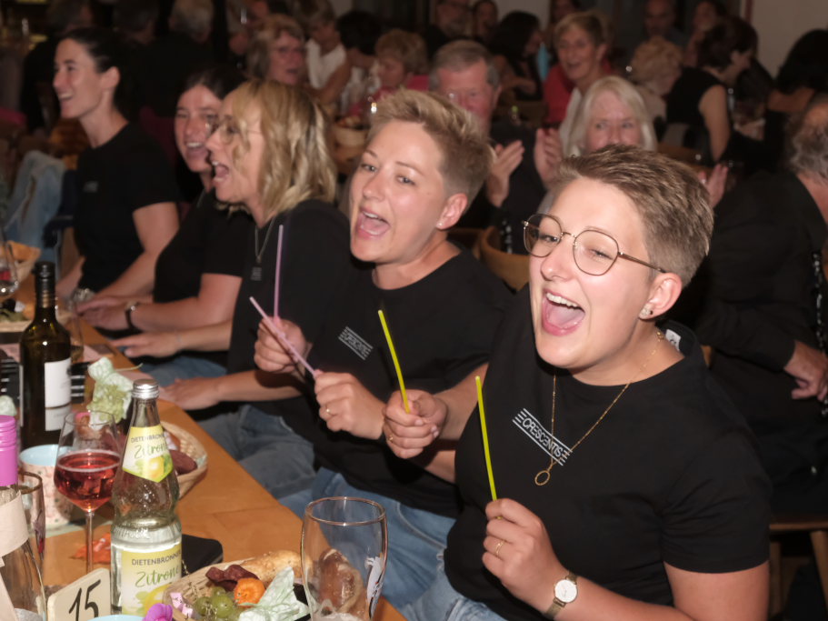 Dann wurde die Bühne zum Ohren- und Augenschmaus, denn die 20 Mädels von Crescentis boten gemeinsam mit ihrem musikalischen Leiter Johannes Tress wirklich beides im Überfluss. Bei „Standby me“ und dem Max Raabe-Titel „Der perfekte Moment“ wussten die selbstbewussten Damen, die zuvor schon fleißig die Stimmung im Saal angekurbelt hatten, voll zu überzeugen.