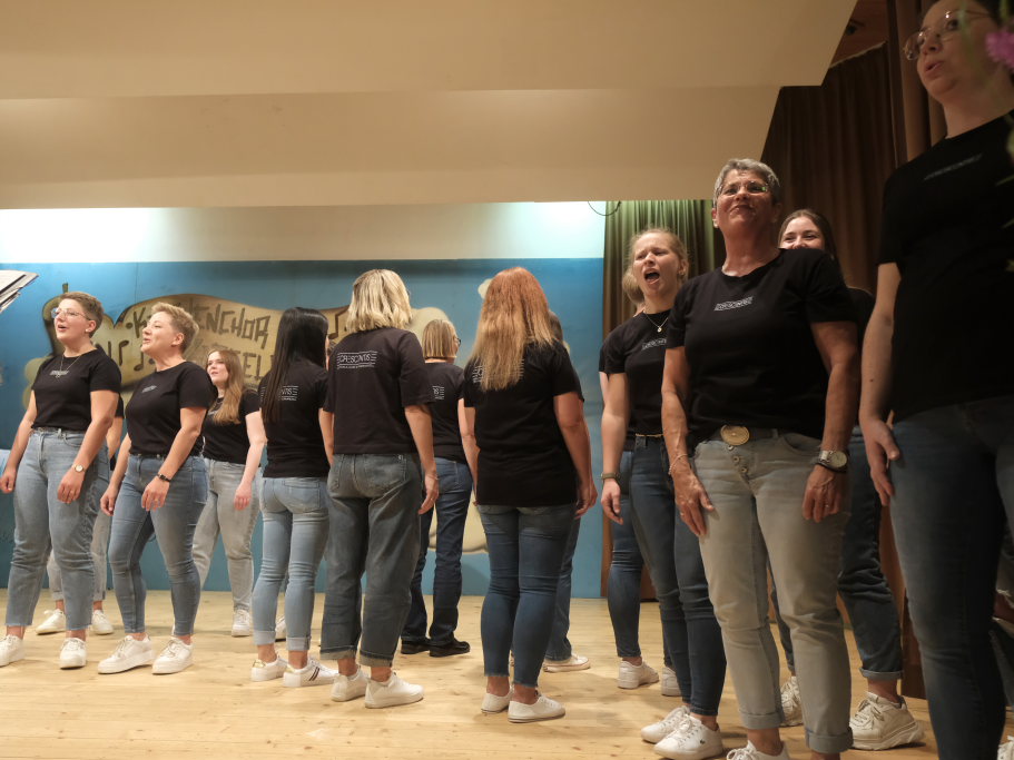 Beim zweiten Teil durfte sich Günter Musch freuen, er stand allein unter „seinen“ Frauen des Kirchenchores beim Lied vom „Mulle“ auf der Bühne. Ihrem Ruf als christlicher Chor gerecht wurden die Sängerinnen dann mit dem mitreißend interpretierten Gospel  „Wade in the water“. Kein Wunder, dass sie danach nicht ohne Zugabe von der Bühne durften.