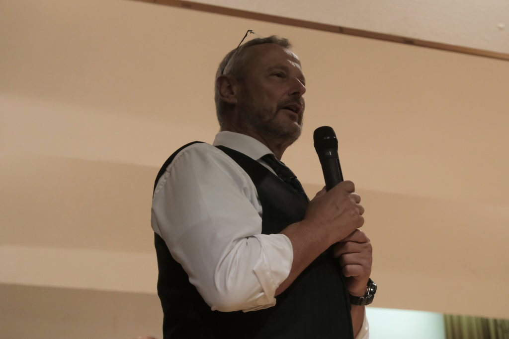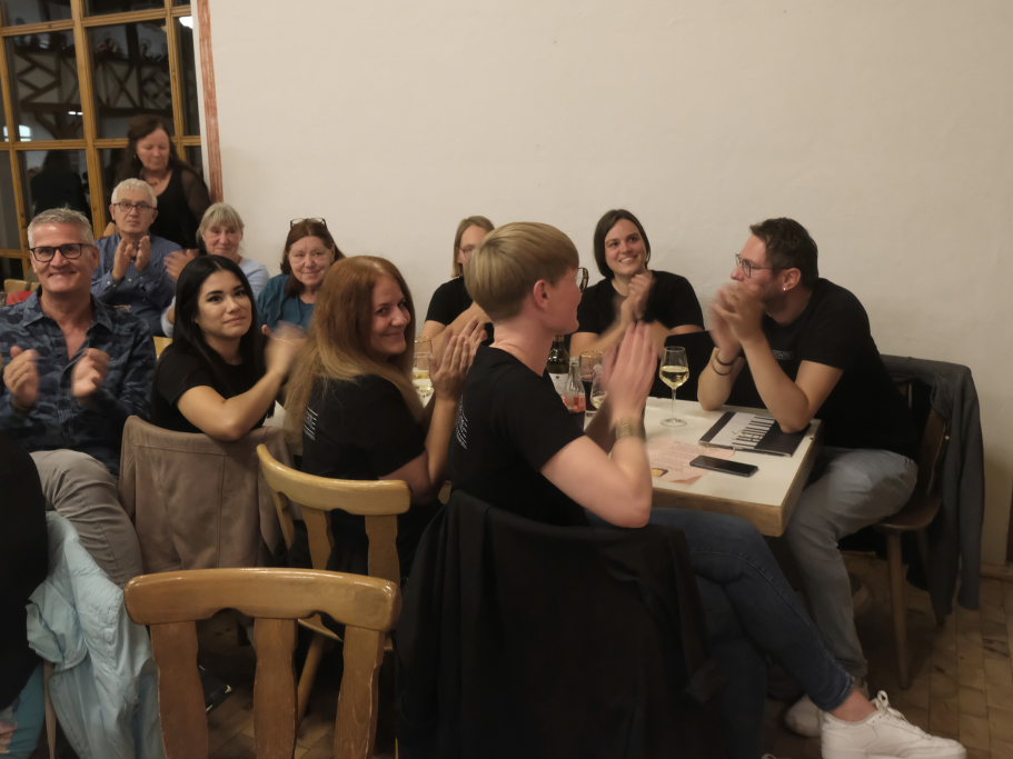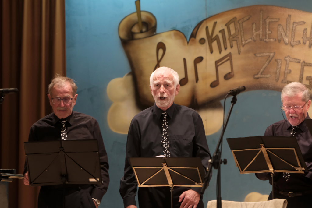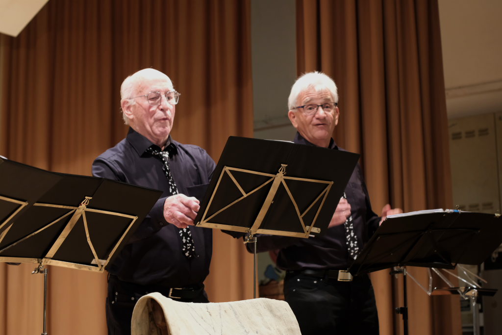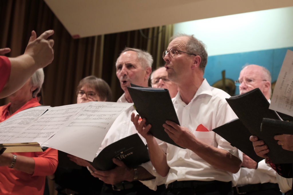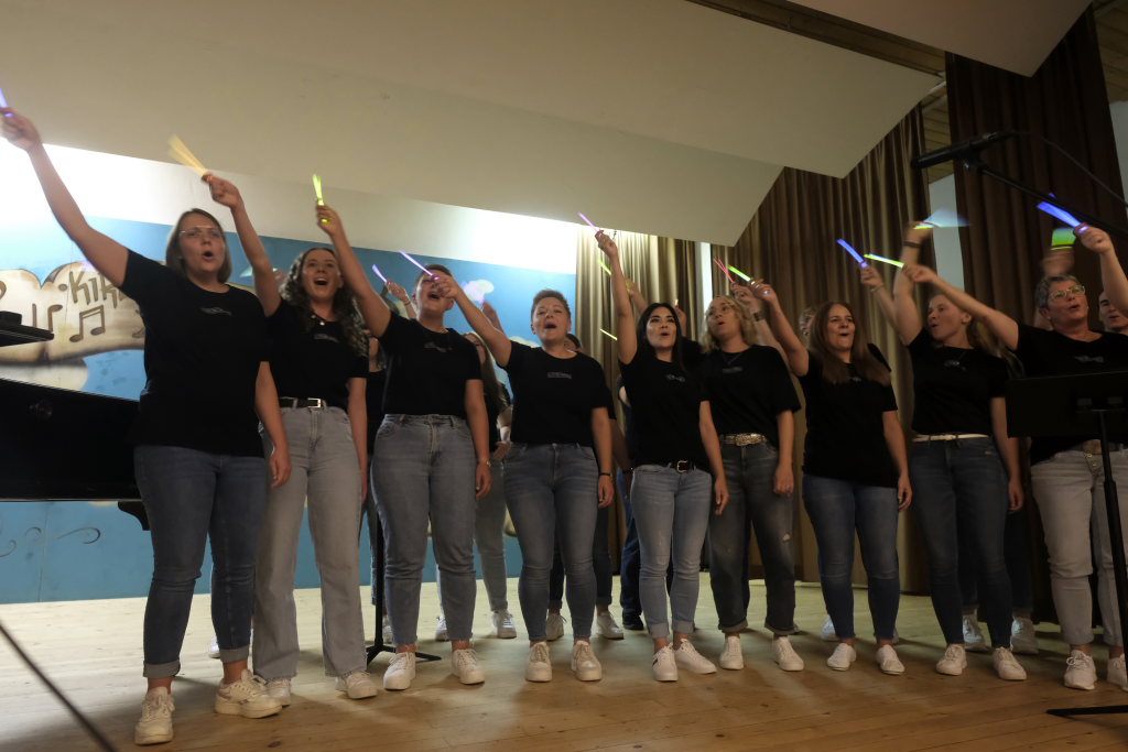 Tine Wespel und Günter Musch luden die Besucher, als sich alle Sängerinnen und Sänger noch einmal auf der Bühne versammelten, zum einen um ein Präsent in Empfang zu nehmen, aber vor allem um gemeinsam mit dem Publikum noch einmal „Die kleine Kneipe“ zu singen, bereits zum nächstjährigen Jubiläums-A-Capella Abend ein, der am 20. September 2025 stattfinden wird.