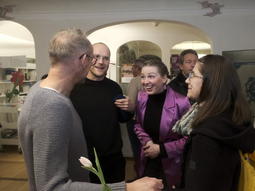 Die Bürgermeisterin als Hausherrin freute sich in ihrer Begrüßung, dass zu dieser „Ausstellung der Premieren“ so viele Gäste (weit über 50) gekommen waren. Denn es war nicht nur die erste Ausstellung des Organisations-Duos, auch für den Künstler selbst war es das erste Mal, dass er seine Werke einer größeren Öffentlichkeit präsentierte. Scherer betonte auch, dass die Galerie gerne einheimischen, regionalen und lokalen Künstlern eine Bühne biete.