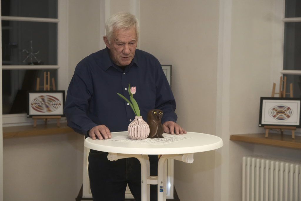 Wie der Sammler von Eulenfiguren – von denen er zur Vernissage als Dekoration einige mitgebracht hatte – und Naturfotograf zur Kunst kam, berichtete er in seiner humorvollen – in freier Rede vorgetragenen – Ausstellungseinführung. Vor 65 Jahren habe er in einem Buch über Kunst der Steinzeit bis zur Gegenwart ein Bild entdeckt, das auf die drei Farben Rot, Blau und Gelb reduziert war. Der Kontrast von Bildaufbau und Ausstrahlung des Bildes hatte ihn dahingehend angesprochen, dass er sich sagte: „Das kann ich auch!“ Und dann geschah 50 Jahre lang – nichts.