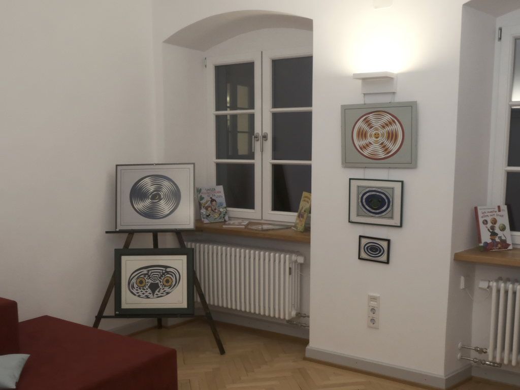 Dann, bereits im Ruhestand, wollte er mehr Farbe in seinem Haus haben, in dem die Farbe Braun dominiert: Braune Holzdecken, braune Fenster, und die Möbel in Eiche rustikal. Deswegen „erfand“ er seine eigene Technik, die Idee zu dieser „Maschine“ hatte er schon lange im Kopf. Vor 14 Monaten war es dann so weit: Zum ersten Mal setzte er seine im Keller an der Decke befestigte Zeichenplatte in Bewegung, ließ den Filzstift „gut hörbar“ darauf kreisen, auf dass er schöne Kreise darauf ziehe. „Malen, hoffen, warten“, nannte er dieses Prinzip in seiner Ausstellungseinführung. In dem Raster der dadurch entstandenen kleinen Felder konnte er sich dann mit Farbe austoben. Auch hier brach seine Liebe zu Eulenfiguren durch und so zeigen einige der insgesamt 44 Unikate auch eindeutig Eulengesichter.
