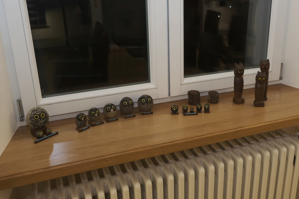Wie der Sammler von Eulenfiguren – von denen er zur Vernissage als Dekoration einige mitgebracht hatte – und Naturfotograf zur Kunst kam, berichtete er in seiner humorvollen – in freier Rede vorgetragenen – Ausstellungseinführung. Vor 65 Jahren habe er in einem Buch über Kunst der Steinzeit bis zur Gegenwart ein Bild entdeckt, das auf die drei Farben Rot, Blau und Gelb reduziert war. Der Kontrast von Bildaufbau und Ausstrahlung des Bildes hatte ihn dahingehend angesprochen, dass er sich sagte: „Das kann ich auch!“ Und dann geschah 50 Jahre lang – nichts.