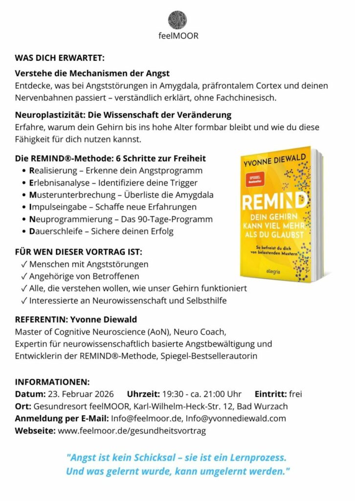 Bad Wurzach – Im Gesundresort feelMOOR in Bad Wurzach (Karl-Wilhelm-Heck-Str. 12) wird am Montag, 23. Februar, der Vortrag „Mechanismen der Angst“ der Angst angeboten (19.30 Uhr). „Angst ist die Reaktion des Körpers auf einen ganz bestimmten Auslöser – doch manchmal bleibt die Angst zu lange aktiv. Dann wird aus einem natürlichen Mechanismus eine unsichtbare Fessel , die das Denken, Fühlen und Handeln einschränkt”, heißt es in der Einladung. In ihrem Impuls-Vortrag „Wenn Angst zur Fessel wird – Wie Dein Gehirn lernt, sich zu befreien“ zeigt die Spiegel-Bestsellerautorin und Neuro-Coach Yvonne Diewald, wie Angst im Gehirn entsteht, und vor allem, wie sie sich nachhaltig auflösen lässt. Wissenschaftlich fundiert, alltagsnah erklärt und mit vielen Aha-Momenten, die sofort wirksam werden können. Sie erfahren, warum sich Angst so hartnäckig hält, weshalb „positives Denken“ nicht funktioniert und wie Neuroplastizität echte innere Freiheit möglich macht.“ Empfohlen ist der Vortrag von Dr. Ana Matt, Chefärztin des Medizinzentrums des feelMOOR-Gesundheitsresorts. Anmeldungen unter www.feelmoor.de. Nachstehend stellt Referentin Yvonne Diewald den Abend vor: