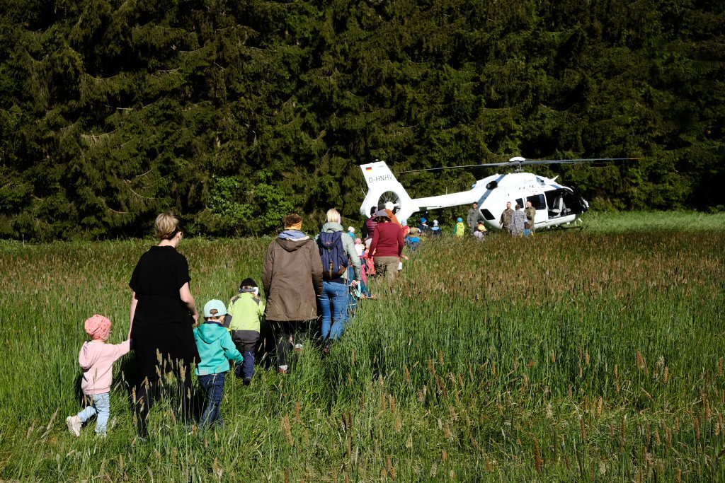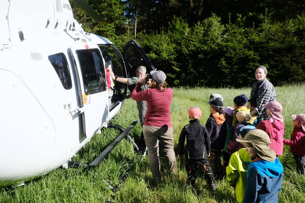 Als dann der Ruf ertönte, „er kommt!“, war die positive Aufregung deutlich in den Gesichtern der Kinder abzulesen. Eine geplante Landung in der Nähe der beiden Bauwagen verwarfen die beiden erfahrenen Piloten wieder, weil sie befürchteten, die heimeligen Bauwagen des Kindergartens könnten durch die Luftverwirbelungen des Hubschraubers beschädigt werden. Sie landeten dann ganz am anderen Ende der Lichtung im hohen Gras.