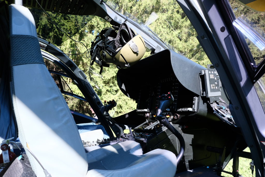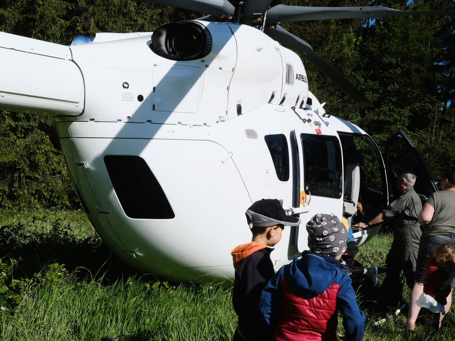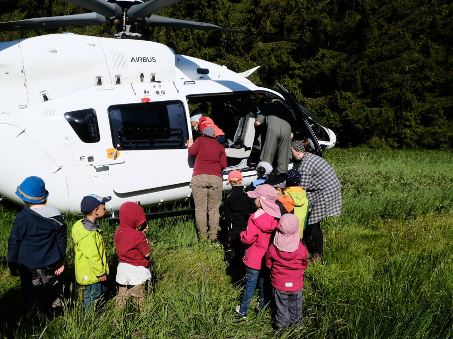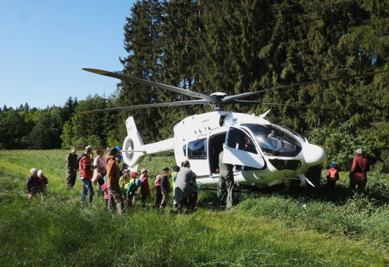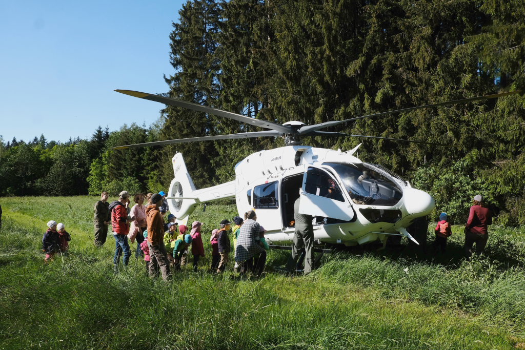 Das tat der Vorfreude der Kinder keinen Abbruch, rasch war ein Trampelpfad durch das hohe Gras bis zum schneeweißen Helikopter getreten, nachdem die Rotorblätter zur Ruhe gekommen waren und die beiden Piloten ausgestiegen waren. Diese gaben den Kindern bereitwillig Auskunft etwa darüber, dass der sich in einer Art Käfig drehende Heckrotor Fenestron heißt, oder dass die „braunen Dinger“ unter den Blättern des Hauptrotors, die den Rotor sich „geschmeidiger“ drehen lässt, keine Schrauben sind. Sie ließen die Kinder gerne die Sitze erklimmen und den „Traum vom Fliegen“ träumen.