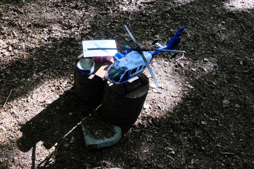 Damit das Ganze auch reibungslos ablaufen konnte, kamen schon am frühen Morgen fünf Soldaten, Offiziere, Unteroffiziere und Mannschaftsdienstgrade quasi als „Bodentruppen“ mit dem Auto aus Laupheim am Waldkindergarten an, wo sie dann im Schatten des Buchenwaldes den Kindern Rede und Antwort standen. Auf einem Baumstumpf stand das Modell eines Hubschraubers, anhand dessen die Soldaten den Kindern erklären konnten, wie so ein Hubschrauber funktioniert und warum er zum Beispiel in der Luft stehen bleiben kann.