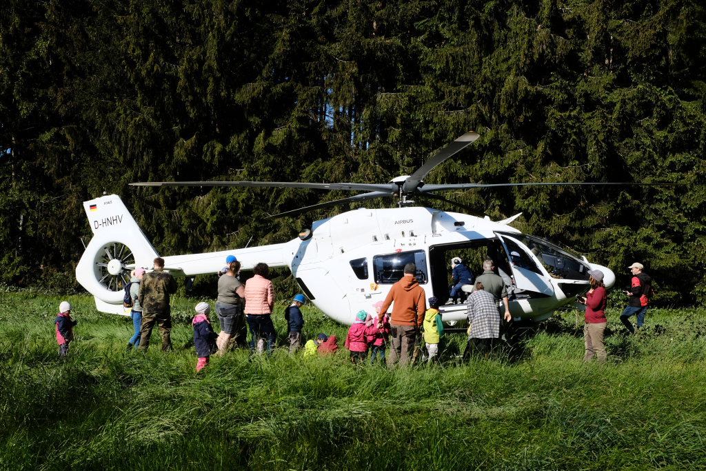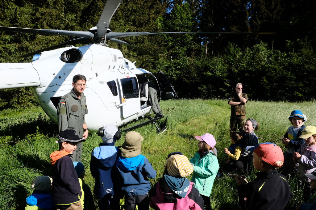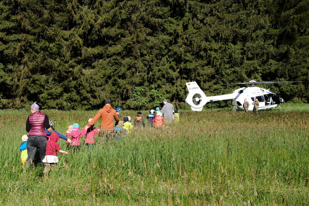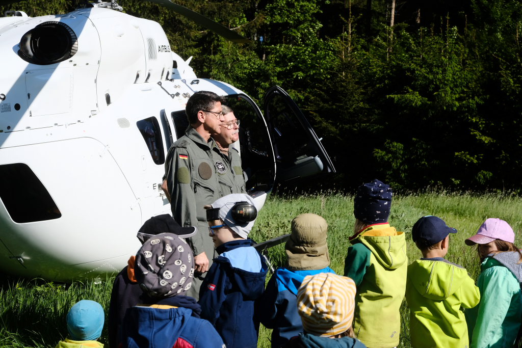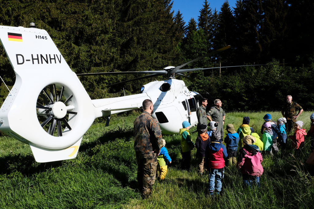 Bad Wurzach – Rund 30 Kinder des Waldkindergartens Bad Wurzach lauschten am Dienstagmorgen, 14. Mai, um 9.00 Uhr ganz gespannt auf die Geräusche am Himmel über den Baumwipfeln, denn es hatte sich ein ganz besonderer Besuch angemeldet: Ein Helikopter des Typs H145 vom Hubschraubergeschwader 64 aus Laupheim sollte auf der Wiese beim Waldkindergarten landen.
