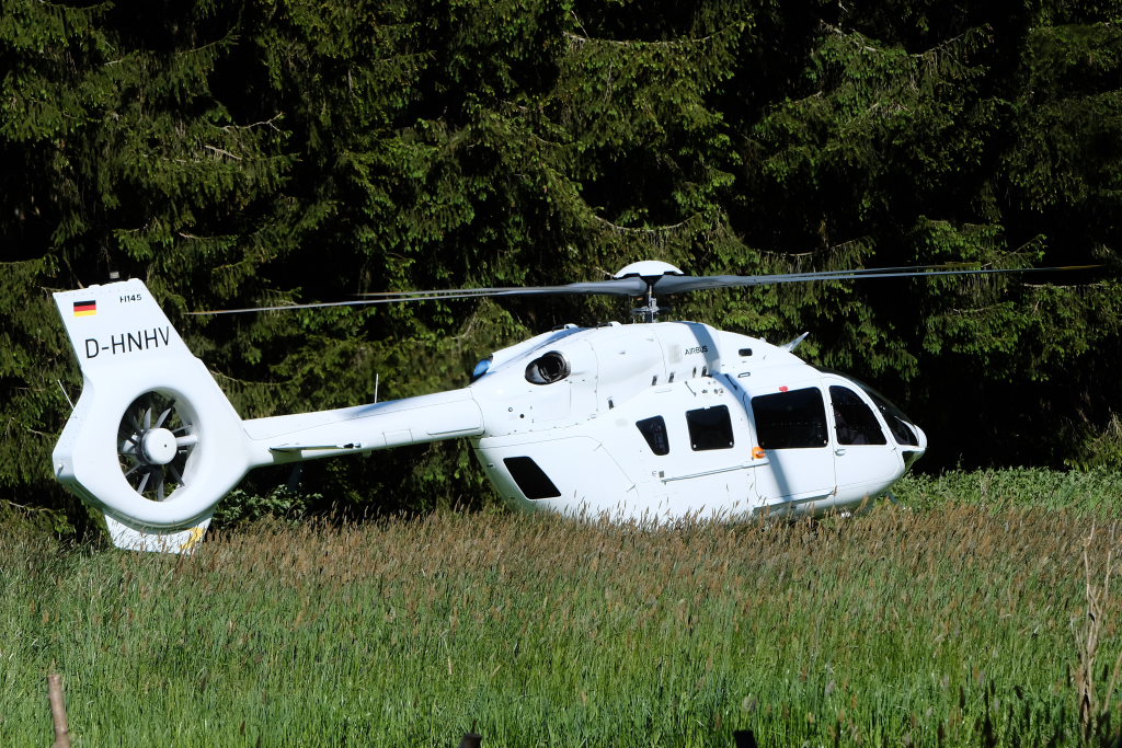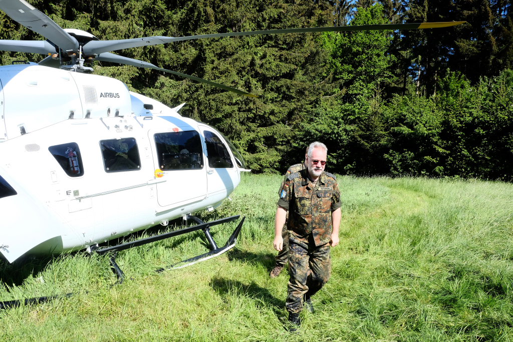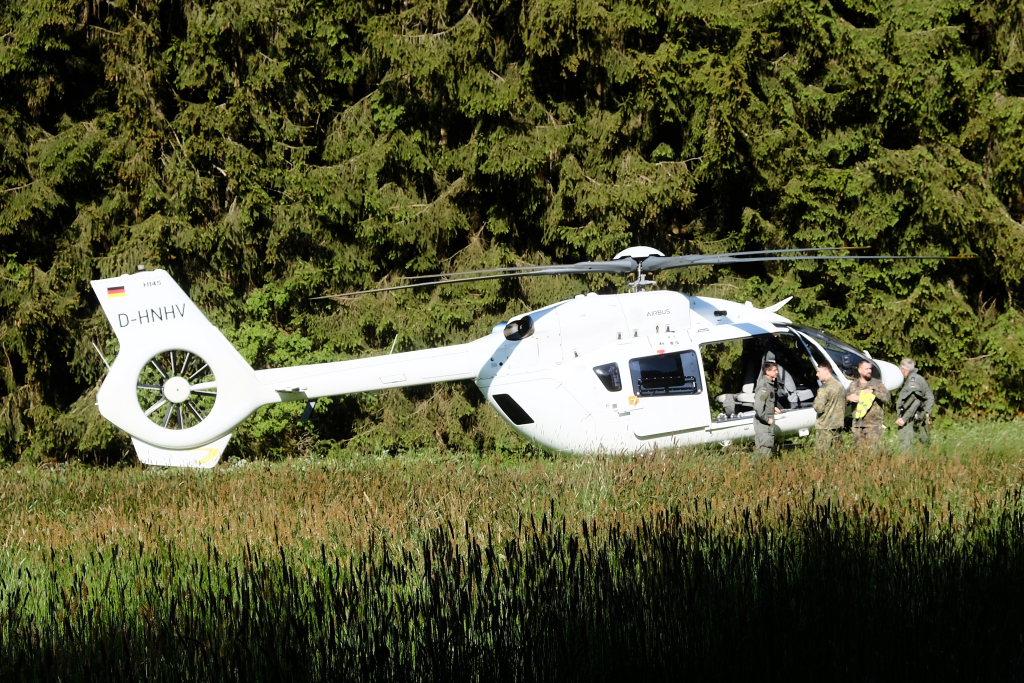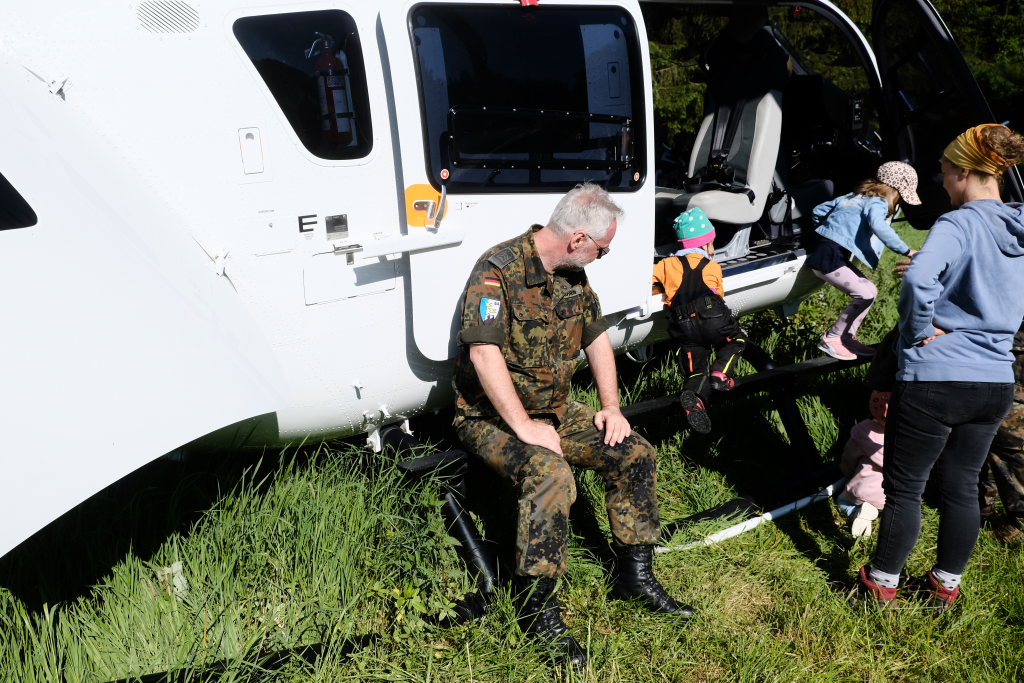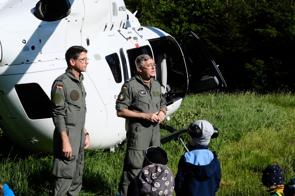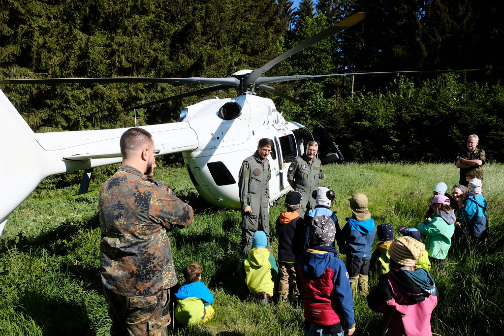 Bad Wurzach – Rund 30 Kinder des Waldkindergartens Bad Wurzach lauschten am Dienstagmorgen, 14. Mai, um 9.00 Uhr ganz gespannt auf die Geräusche am Himmel über den Baumwipfeln, denn es hatte sich ein ganz besonderer Besuch angemeldet: Ein Helikopter des Typs H145 vom Hubschraubergeschwader 64 aus Laupheim sollte auf der Wiese beim Waldkindergarten landen.