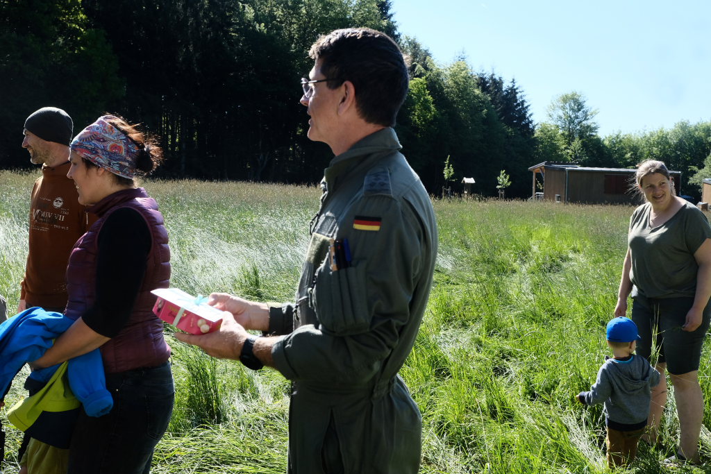 Zum Abschied bekamen die Piloten noch etwas Süßes mit auf den Weg und ein Album mit selbstgemalten Bildern der Kinder – natürlich von Hubschraubern. Nach einer Stunde setzte der Helikopter seien Flug fort. Zurück blieb auf der Wiese ein großer Abdruck mit umgeknickten Grashalmen, aber bei den Kindern Erinnerungen, die sie wahrscheinlich ihr ganzes Leben nicht mehr vergessen werden.