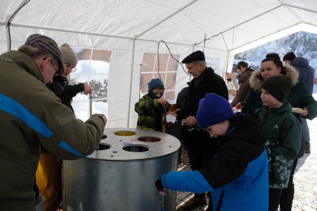 Bis zur Prämierung der am besten und schönsten dekorierten Hütte spielte im kleinen Musikzelt vor der Kirchentreppe noch der Musikverein Unterschwarzach, an diesem laut Aussage von Gisela Brodd, die neben ihrer Orga-Tätigkeit auch noch die Moderation der einzelnen Programmpunkte übernahm, „traumhaft schönen Winter- und Weihnachtsmarkttag“. Nachdem sich mit Johanne Gaipl und Albertine Schoeters, die seitens der Bad-Wurzach-Information-Verantwortlichen – wieder vor dem Zelt zum Höhepunkt des Sonntages versammelt hatten, konnte Brodd mit der Preisverleihung beginnen, nicht jedoch ohne dem Bauhof für seine überragende Leistung in den Tagen der Vorbereitung und auch während der letzten 24 Stunden den Dank des gesamten Teams auszusprechen und einen großen Applaus einzufordern. „Ich ziehe meinen Hut vor dem, was sie geleistet haben.“ Dem lieben Gott dankte sie, dass er den Organisatoren an diesem Tag ein so perfektes Winterwetter geschenkt hatte.