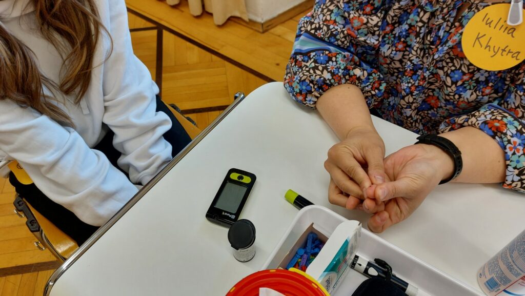 beim Blutdruck entstehen und wie man ihn misst. Auch das Messen des Glucosewertes im Blut wurde demonstriert und dabei darauf hingewiesen, wie wichtig das Einhalten von Hygienestandards ist. Ganz mutige Schüler durften unter fachkundiger Anleitung sogar selber Hand anlegen und bei einer Pflegeschülerin eine kleine Menge Blut abnehmen und mit dem Gerät messen. Der ein oder andere Schüler überwand seine Berührungsängste. Hier konnten die Fachleute auch beruhigen: „Andere Menschen anzufassen wird im Laufe der Zeit zur Gewohnheit.“
