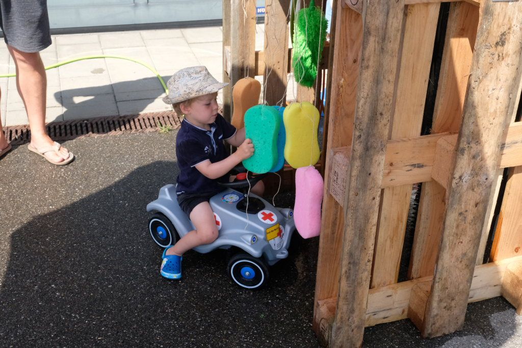 Neben dem Altbewährtem wie Hüpfburg und Zielspritzen bei der Jugendfeuerwehr gab es auch wieder viel Neues für die kleinen und großen Kinder zu entdecken. Da hatte zum Beispiel das Rote Kreuz neben der „Versorgung“ mit schweren Verletzungen durch geschickte Maskenbildner auch solche mit Glitzertattoes. Einen ernsthaften Hintergrund hatte dabei auch die Erkundung der menschlichen Anatomie und vor allem, wie man eine leblose Person durch Herzdruckmassage wiederbelebt. Ganz spontan war aufgrund der großen Hitze die Autowaschstraße entstanden, eine Idee von Petra Greiner, der Ortsvereinsvorsitzenden des DRK, mit durchschlagendem Erfolg. Die Kinder durchfuhren auf Bobbycars die Waschstraße. Das gefiel einem kleinen Mädchen, das nach Aussage der Mutter eigentlich keine Abkühlung durch Wasser mochte, aber so gut, dass es Runde um Runde durch die Waschstraße drehte und gar nicht genug davon bekommen konnte.