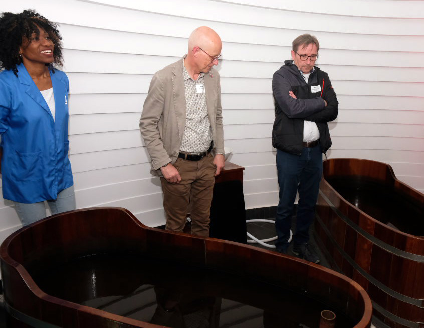Die Zeiten haben sich gewandelt, das Moor, das einst den Aufstieg der Stadt mitverantwortete, kommt nicht mehr aus dem Naturschutzgebiet Wurzacher Ried. 3000 Kubikmeter werden jährlich per LKW vom Abbauplatz im Reicher Moos nach Bad Wurzach gefahren, um dann in den Katakomben des Kuranwendungsbereichs „gemahlen“ zu werden, sprich von Hand von Fremdstoffen gereinigt zu werden, berichtet Christian Heil der Besuchergruppe im Angesicht der Moormühle tief im dunklen Keller des Hotels. „Das ist eine echte Knochenarbeit“, erzählt Heil. Denn dort unten ist es heiß und laut. Dort wird das „schwarze Gold“ dann mit dem von der Quelle beim Wohnmobilstellplatz hochgepumpten etwa 25 Grad warmen Thermalwasser vermengt; und anschließend in die sechs Einzelkabinen mit ihren modernen Moorbadewannen oder die Doppelkabine mit seinen beiden offenen Holzzubern im mit Wechselbeleuchtung ausgestatteten Separée gepumpt.