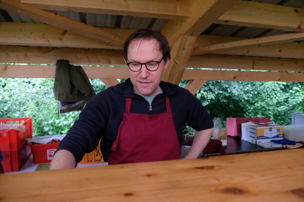 So sieht Arbeitsteilung beim Wiesenfest bei der Pfarrersfamilie Kuczera aus: Während Silke Kuczera als Gemeindepfarrerin den Gottesdienst zelebrierte, sorgte ihr Ehemann Michael unterdessen dafür, dass nach dem Ende des Gottesdienstes die Grillwürstchen abholfertig auf die hungrigen Gäste warteten. Wegen des Regenwetters wurde den Festbesuchern eine Art „Roter Teppich“ bis zum Essensstand ausgerollt, mit der entsprechenden Überdachung, so dass sie trockenen Fußes (und Hauptes) mit ihrem Essen zurück in Gemeindesaal oder Kirche kommen konnten.