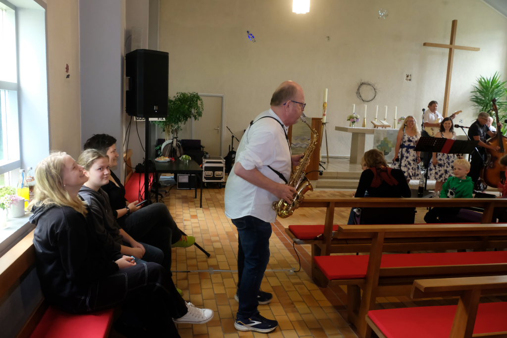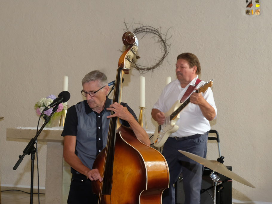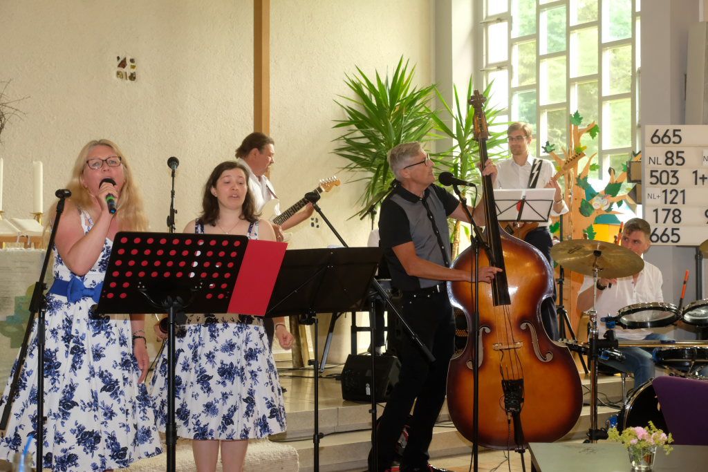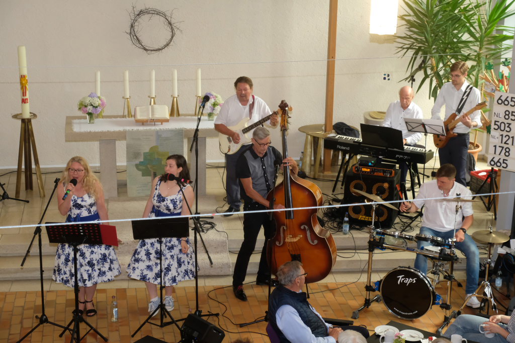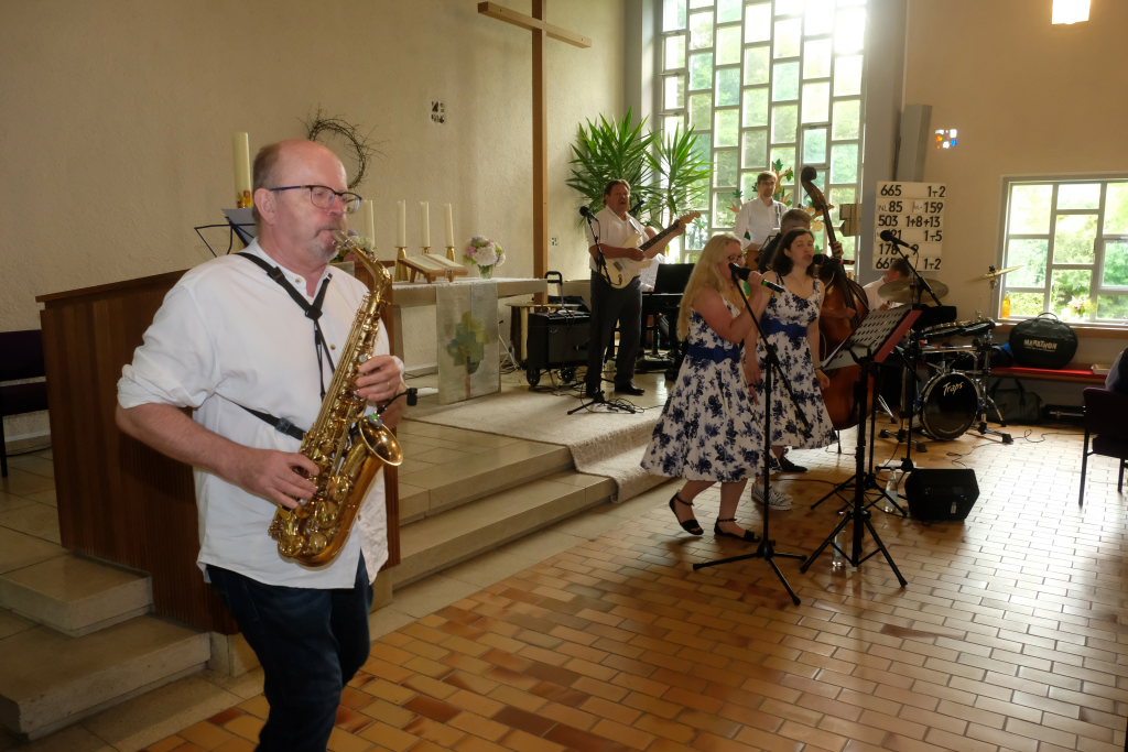Nachdem der größte Hunger der Gäste mit Steak, Würstchen, Pommes und leckeren Salaten gestillt war und auch die Kaffee- und Kuchentheke eröffnet hatte, ging es in der Kirche für die Erwachsenen mit der Rock´n´Roll Band Marsh Marigold und alten Rock´n´Roll-Klassikern noch einmal richtig rund.