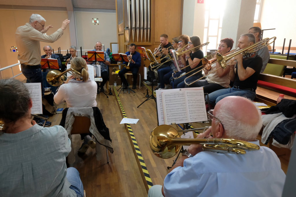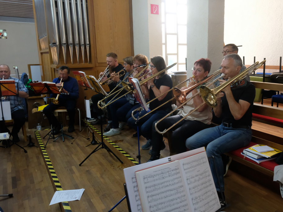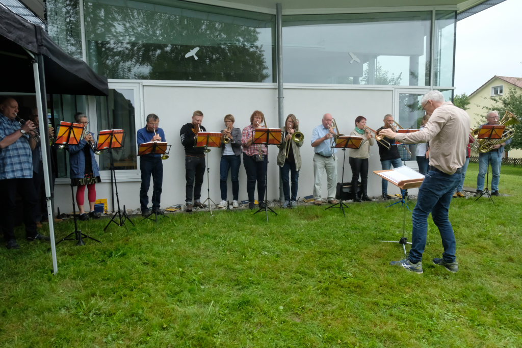 Das Platzkonzert des Posaunenchores, der in diesem Jahr bereits sein 60jähriges Jubiläum gefeiert hatte, fand zunächst in der Kirche auf der Empore statt. Als der Regen etwas nachließ, sorgten die Bläser noch kurz im Freien für mitwippende Füße.