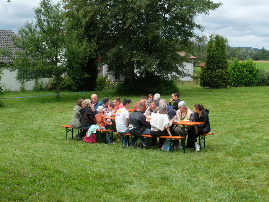 Derweil, nachdem inzwischen die Sonne aus den Wolken hervorlugte, hatten ein paar ganz Mutige einige Biertischgarnituren dorthin gestellt, wo sonst immer das ganze Fest stattfindet, nämlich auf die dem Fest seinen Namen gebende grüne Wiese bei der Kirche, um sich in Ruhe unterhalten zu können.