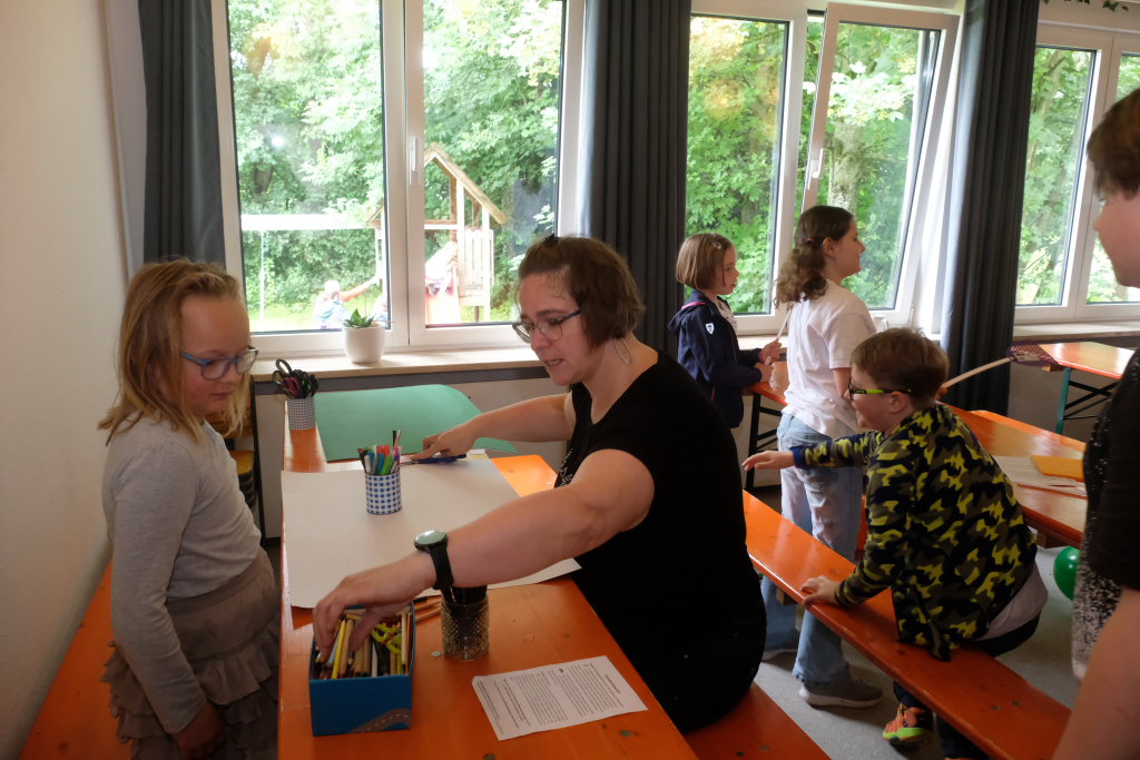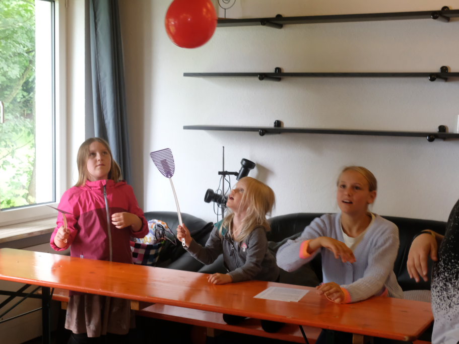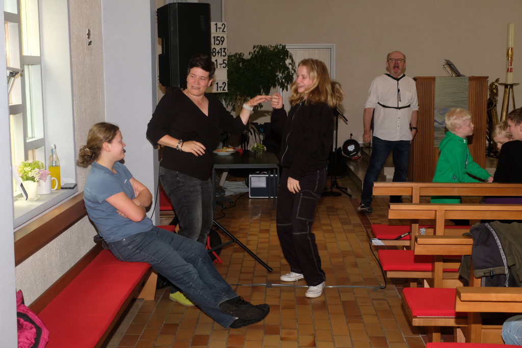 Für die Kinder gab es wieder viele Spiele. So wurde die beliebte Slackline, die an der Grenze zum Nachbargrundstück zwischen zwei Bäumen gezogen war, ungeachtet des zunächst regnerischen Wetters, fleissig genutzt. Im „Jugend-Zimmer“, das von der letzten Konfirmandengeneration nach eigenen Vorstellungen neu gestrichen worden ist hatten sie unter dem Motto „Spiele &Kreatives“ auch viele Spielmöglichkeiten im Trockenen.