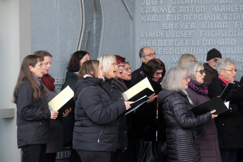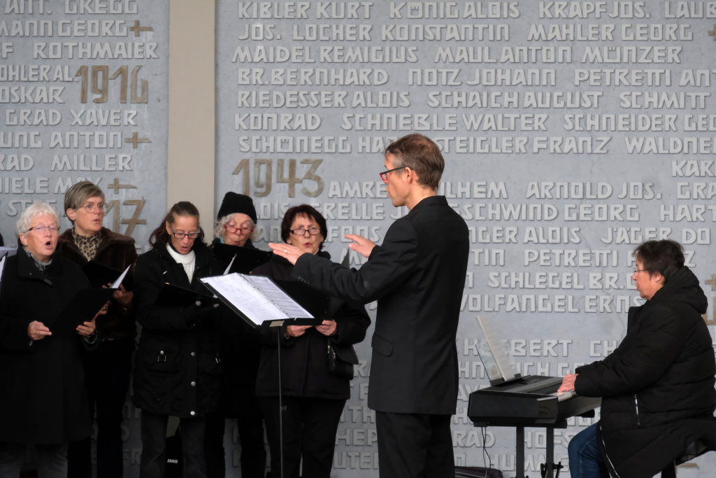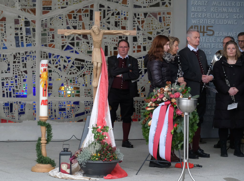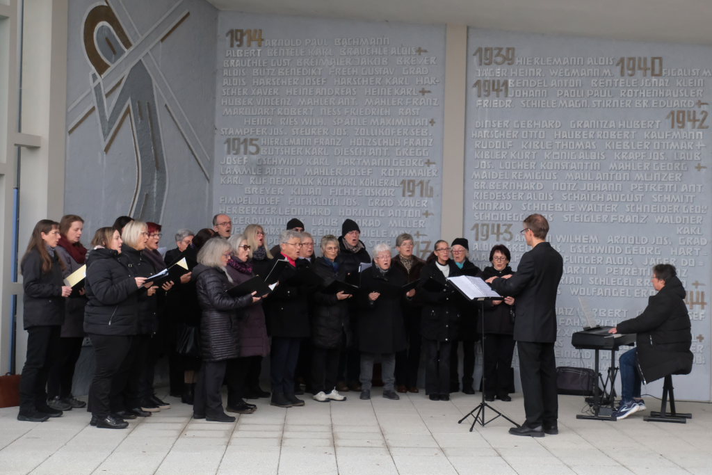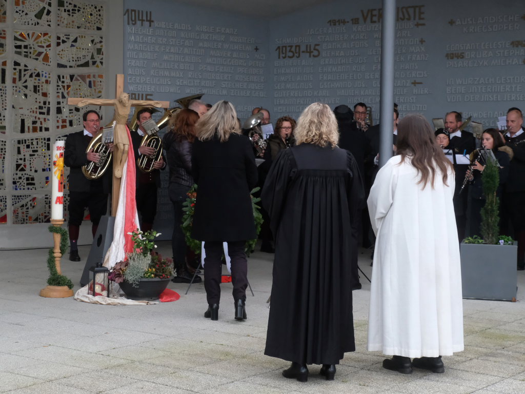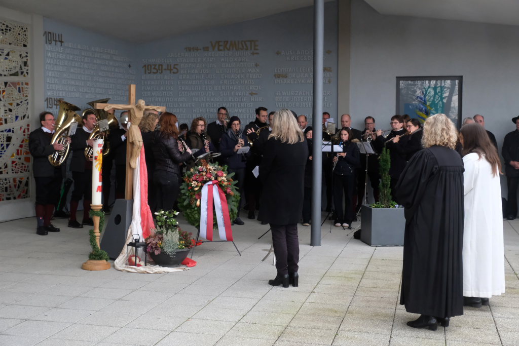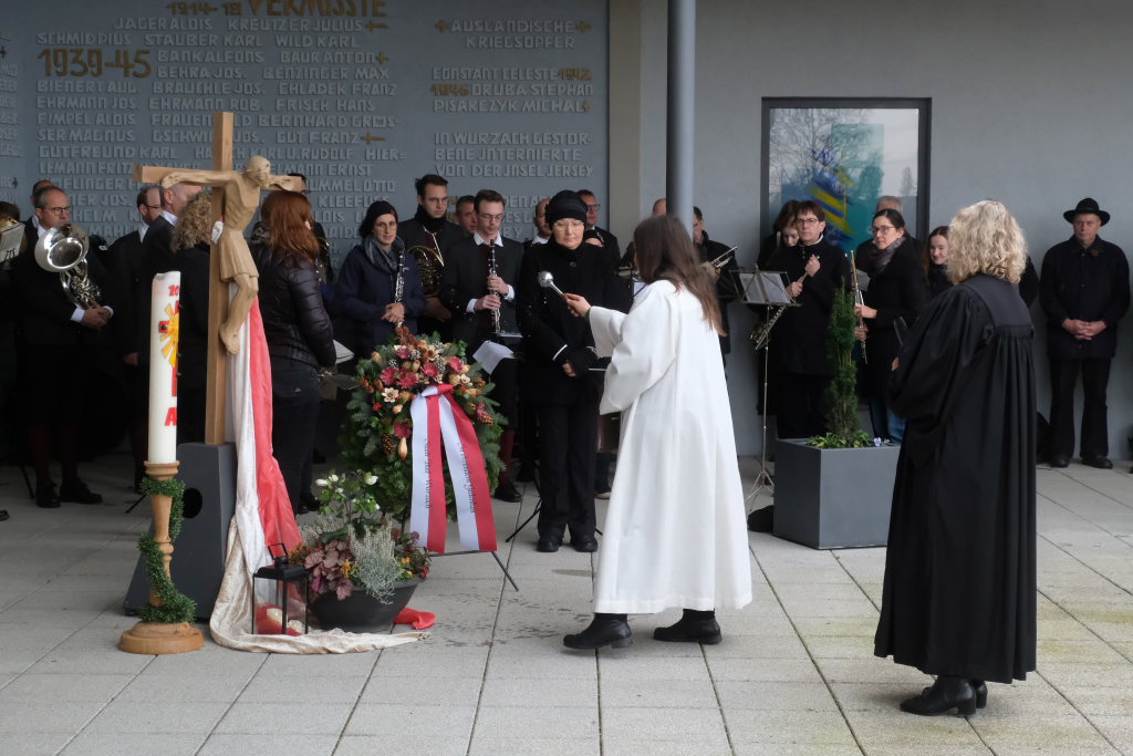 Bad Wurzach – Alljährlich wird in ganz Deutschland und selbstverständlich auch in Bad Wurzach am Volkstrauertag der Opfer von Kriegen und Gewalt gedacht. Bürgermeisterin Alexandra Scherer tat dies in diesem Jahr gemeinsam mit drei Schülerinnen der 9. Klasse der Realschule, Pfarrerin Silke Kuczera von der evangelischen und Pastoralreferentin Anna Katharina Merk von der katholischen Kirchengemeinde sowie der Stadtkapelle und dem Liederkranz Chorioso, welche der Gedenkfeier am vergangenen Sonntag (16.11.) den würdevollen musikalischen Rahmen gaben.
