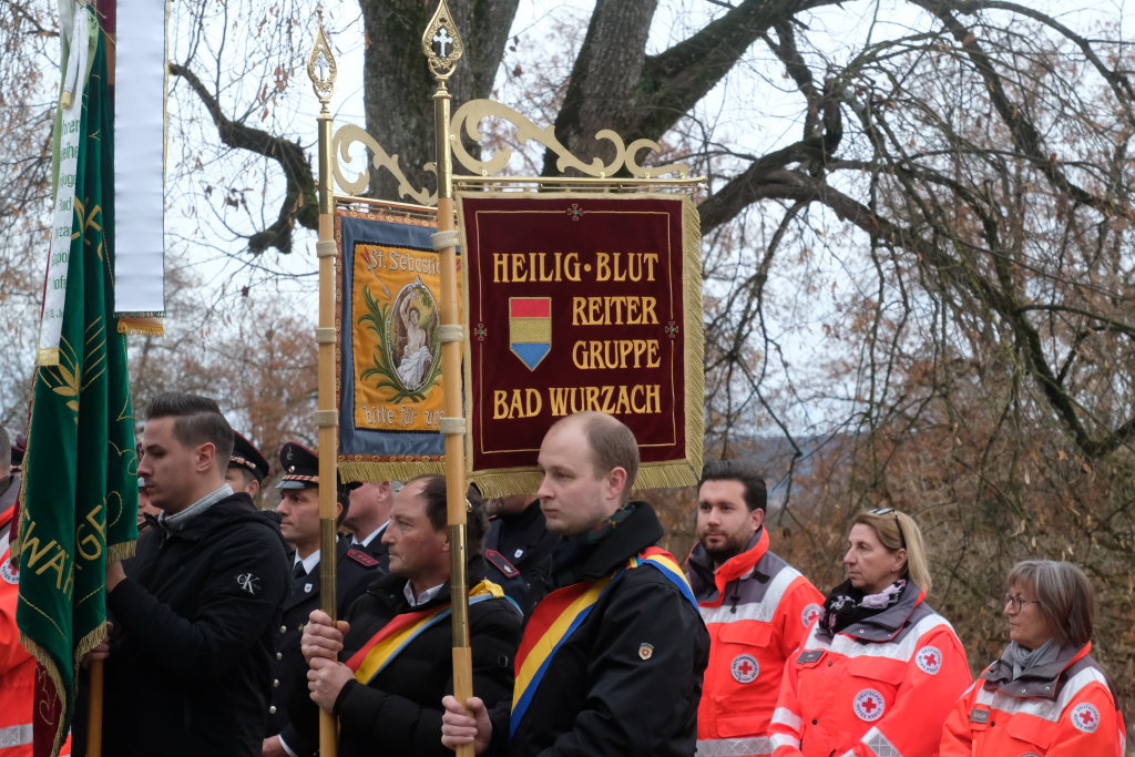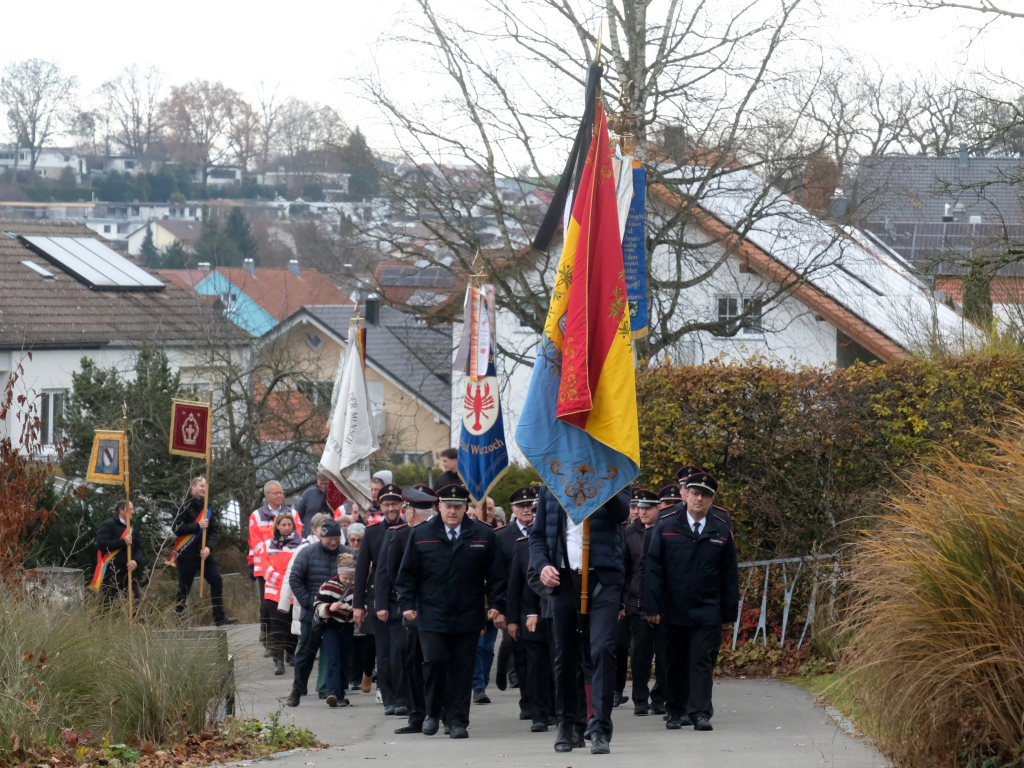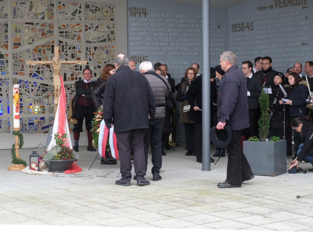 Gemeinsam mit den Fahnenabordnungen der Vereine, großen Abordnungen von Feuerwehr und DRK zogen Bürgermeisterin und Gemeinderäte nach einem ökumenischen Gottesdienst in St. Verena hinauf zur Gedenkstätte für die Opfer der beiden Weltkriege oberhalb des Friedhofes, wo sie Stadtkapelle und Chorioso bereits erwarteten.