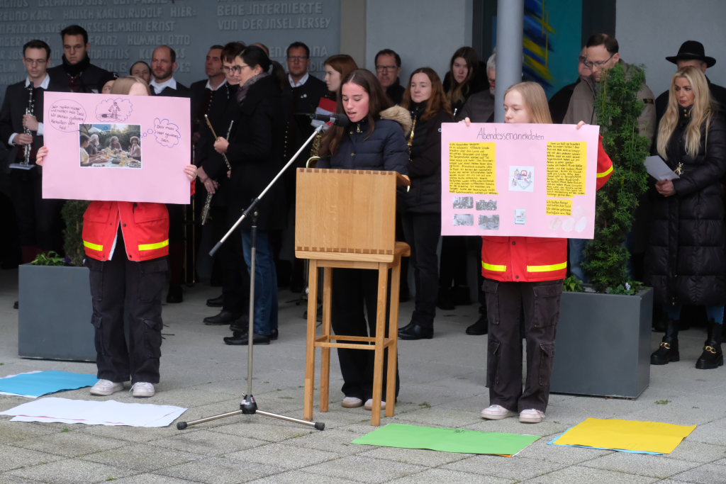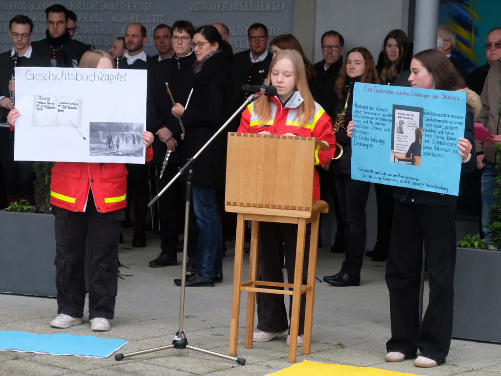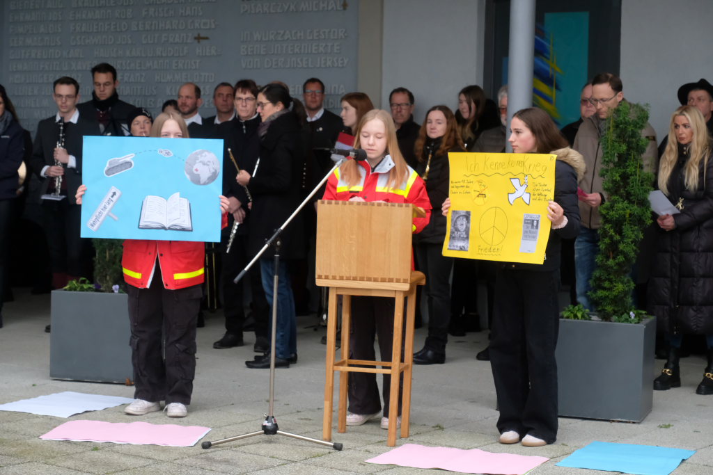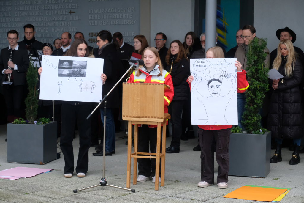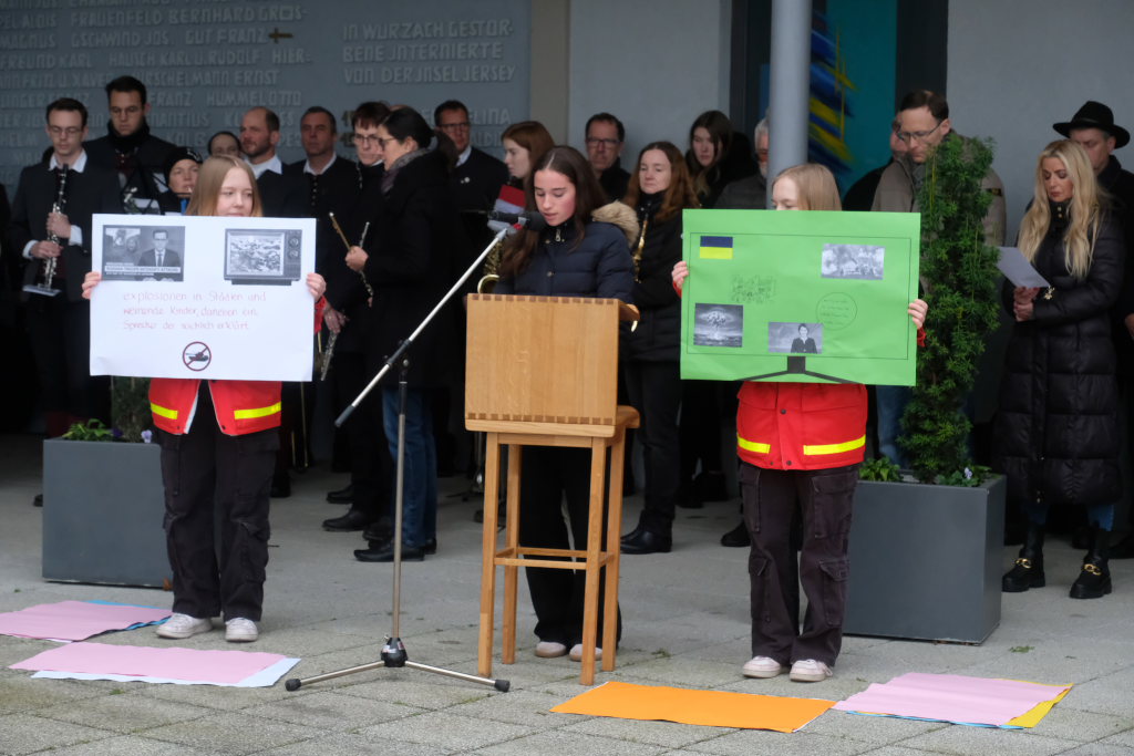 Nach einem gesungenen ersten Choral des Chorioso zeigten auf ungewöhnliche Weise die drei Schülerinnen Larissa und Angelina Koch sowie Leonie Heine der 9. Klasse der Realschule Bad Wurzach die Ergebnisse ihrer Gedanken zum Thema, das sie im Geschichtsunterricht mit ihren Lehrern Angelika Miller und Dietmar Bähr erarbeitet hatten, wie Schulleiter Dietmar Schiller in seiner kurzen Einführung erläuterte. Die Schülerinnen hatten nämlich das Gedicht „Ich kenne keinen Krieg“ von Janina Bodendörfer in Bildern visualisiert. In dessen letzter Strophe heißt es unter anderem: „Ich kann seine Schrecken nur benennen … Ich wünschte, ein jeder würd´ ihn wie ich nur noch vom Hörensagen kennen.“