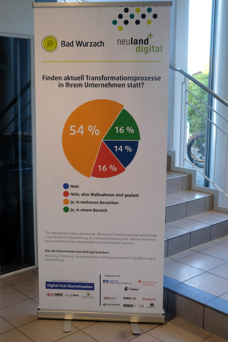 Anlass für diesen Workshop waren die Umfrage-Ergebnisse, auf die 50 Unternehmen aus Bad Wurzach und der Region auf die Frage geantwortet hatten: Finden aktuell Transformationsprozesse in ihrem Unternehmen statt? In mehr als der Hälfte der Unternehmen finden solche Prozesse in Digitalisierung, KI und Automatisierung bereichsübergreifend statt, je 16% antworteten mit ja, in einem Bereich oder es sind solche Maßnahmen geplant. In 14% der Unternehmen geschieht dies nicht. Was die Unternehmen laut Unternehmen dabei brauchen ist Beratung, Förderung Netzwerktreffen und Erfahrungsaustausch, Qualifizierung und Weiterbildung.